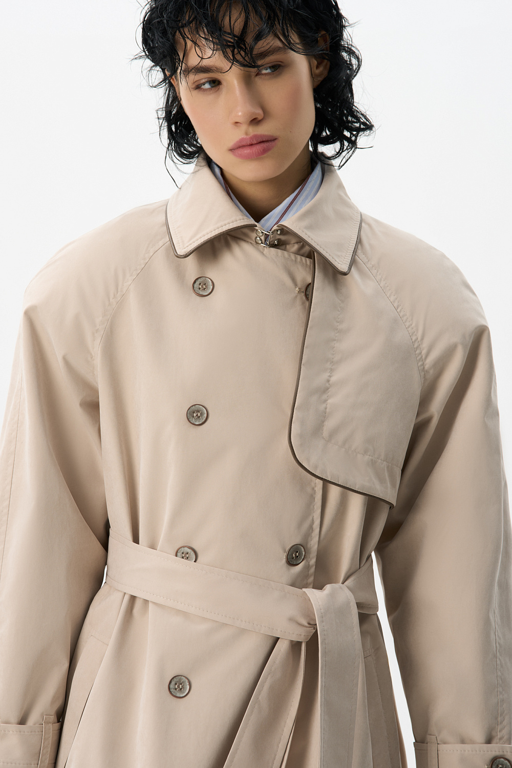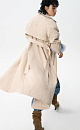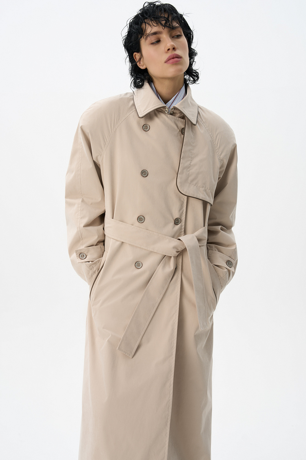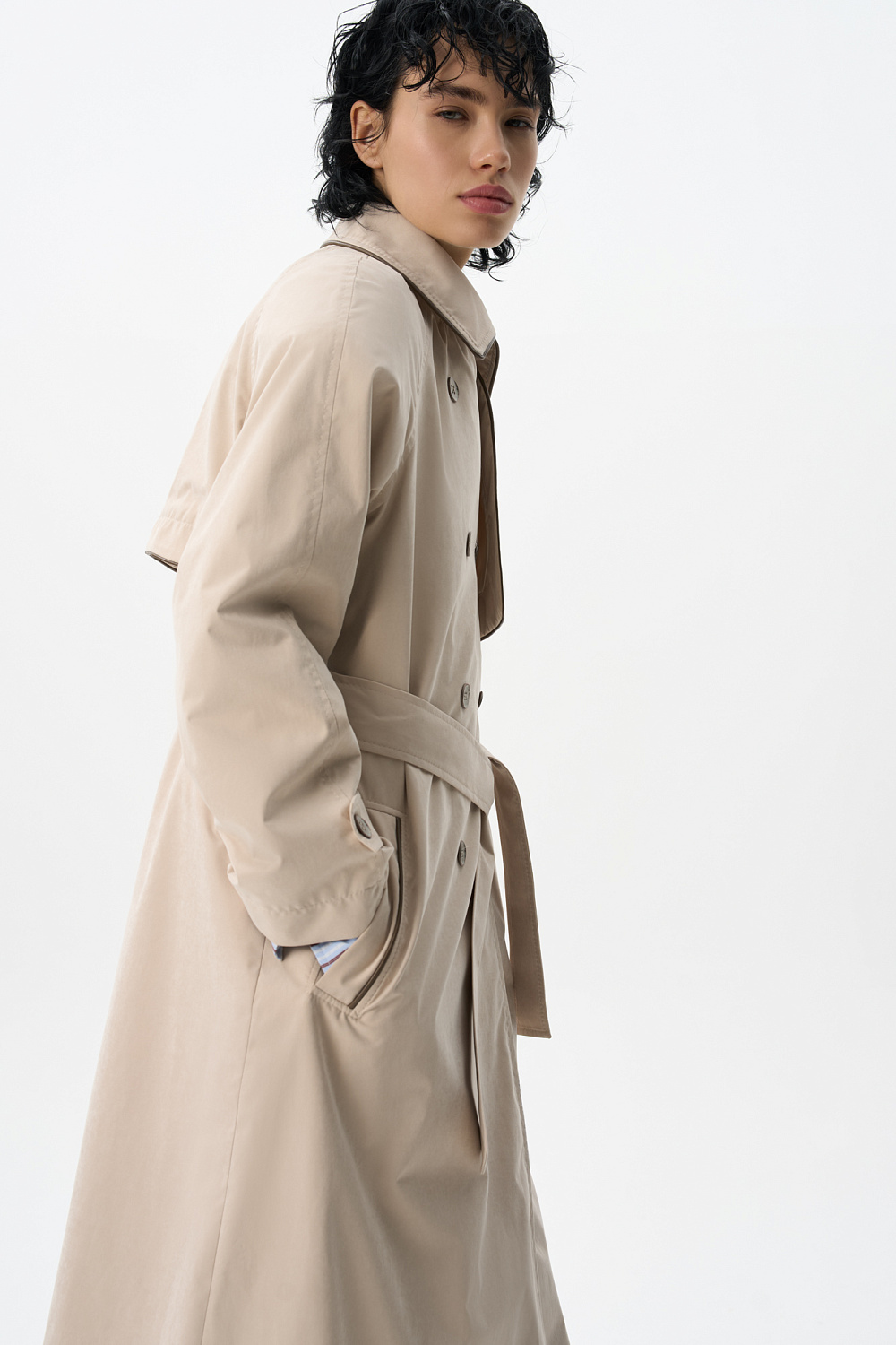 Loose fit, double-breasted trench coat with a turn-down collar with metal fastening. Asymmetrical flap and side pockets. Detachable tie belt at the waist. Lined.