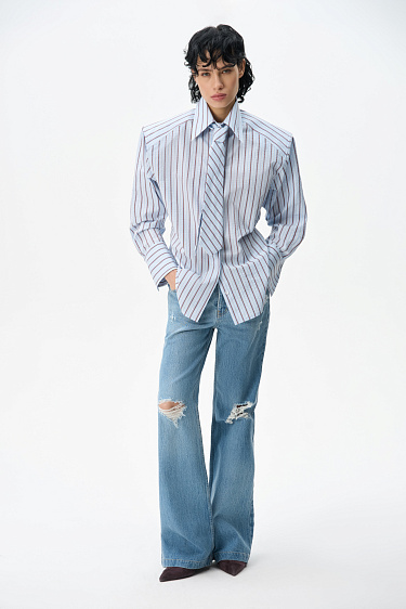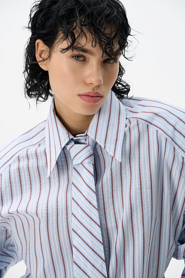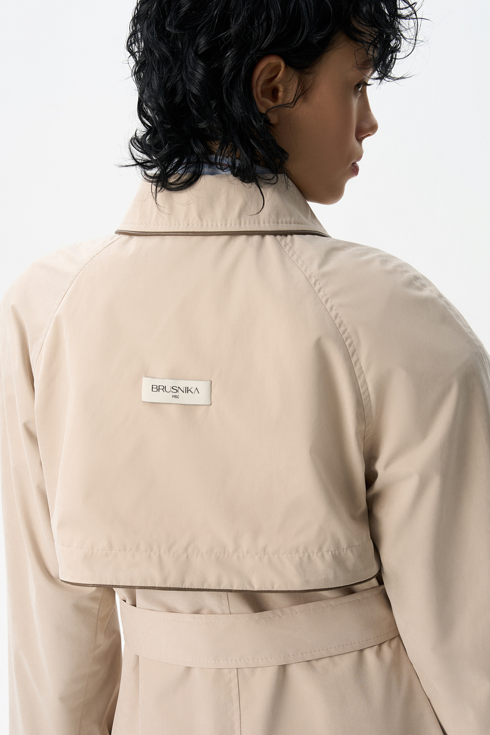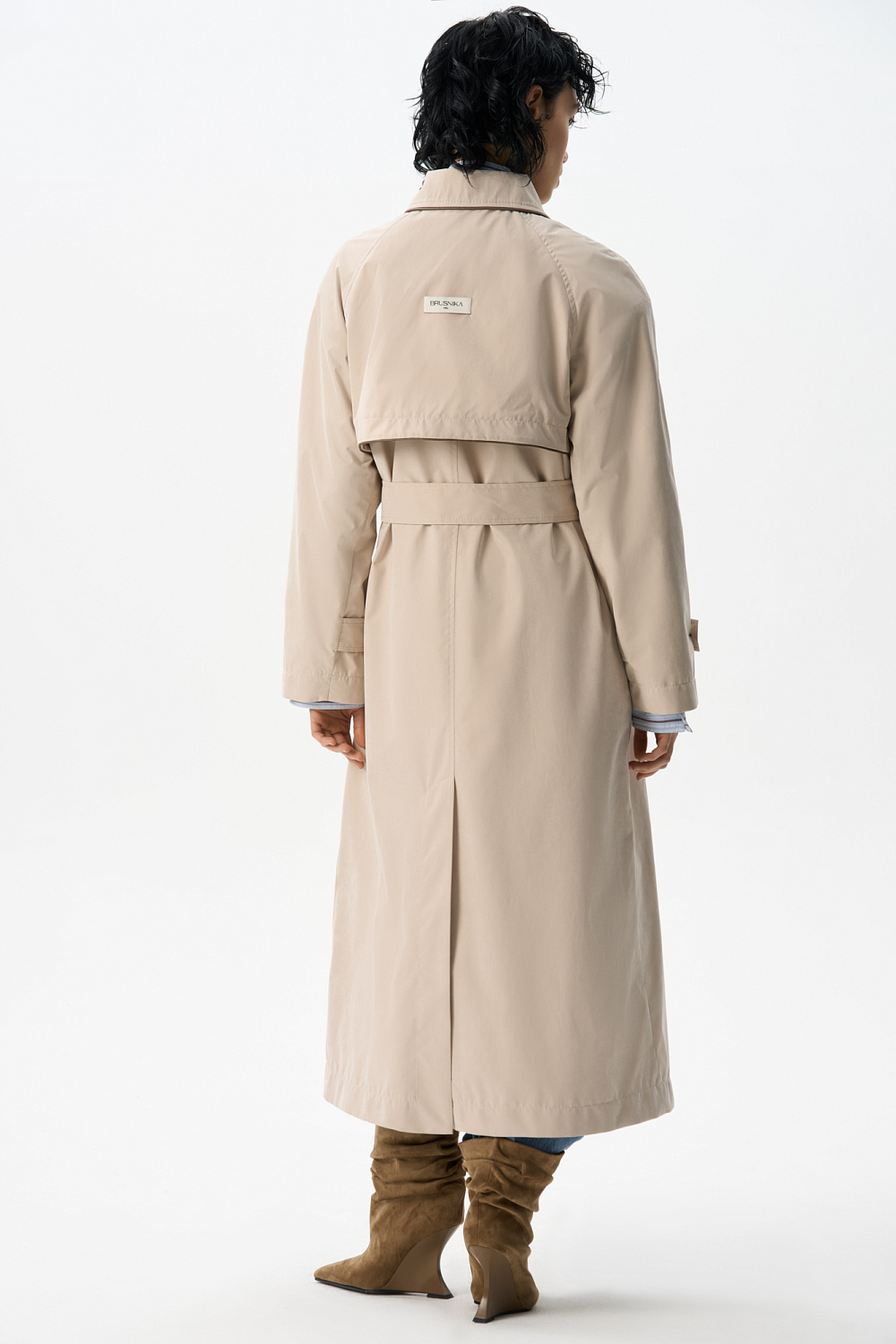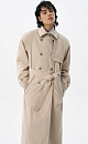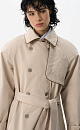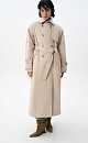 Loose fit, double-breasted trench coat with a turn-down collar with metal fastening. Asymmetrical flap and side pockets. Detachable tie belt at the waist. Lined.
