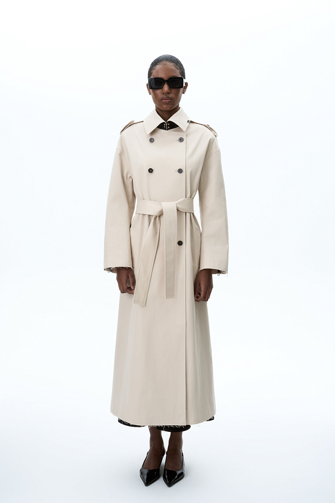 Double-breasted trench coat with raw edges