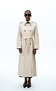 Double-breasted trench coat with raw edges and button fastening at the collar. Loose-fit silhouette with a wide tie belt at the waist and side pockets. Shoulder tabs with button. Lined.
