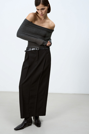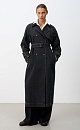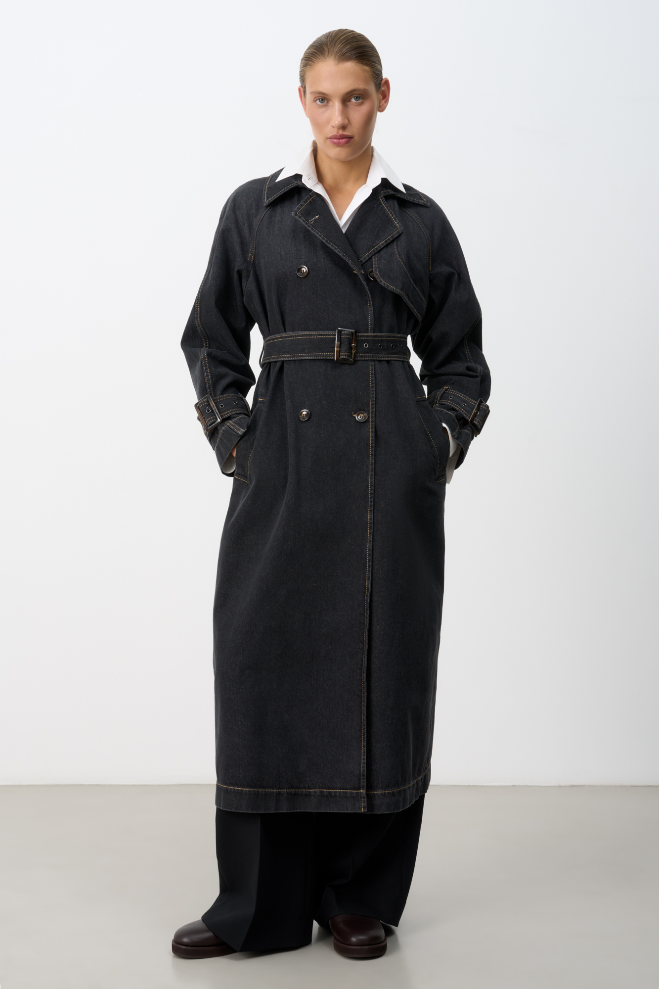 Double-breasted denim wrap trench coat without lining. Asymmetrical yoke, turn-down collar, cuffs and wide belt made of basic material.