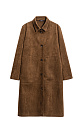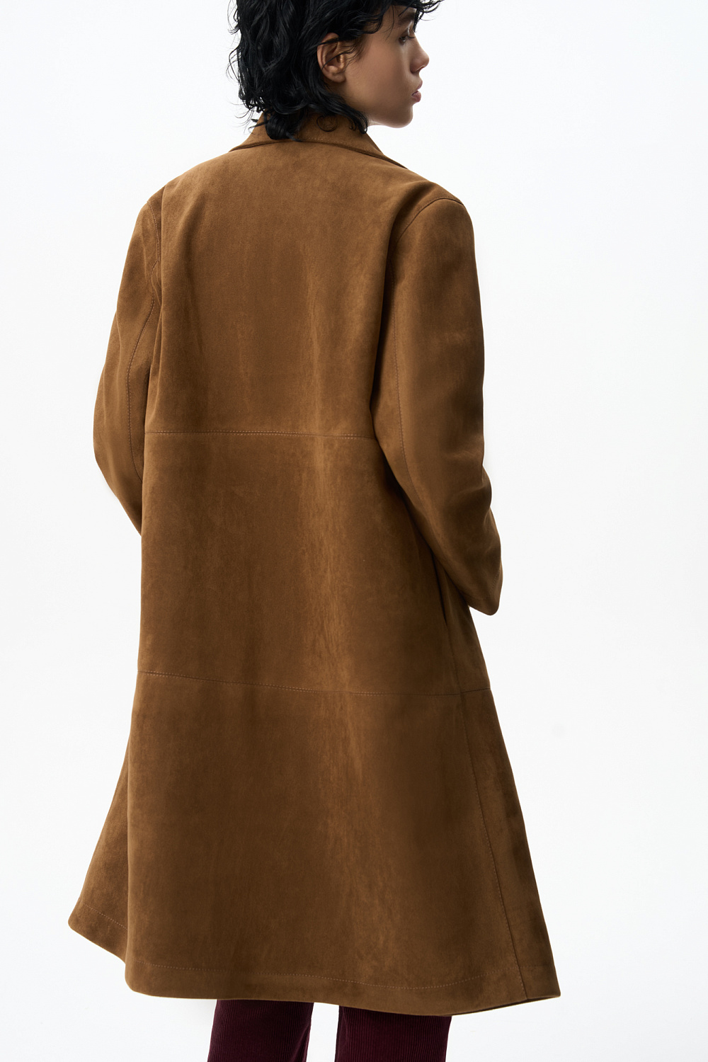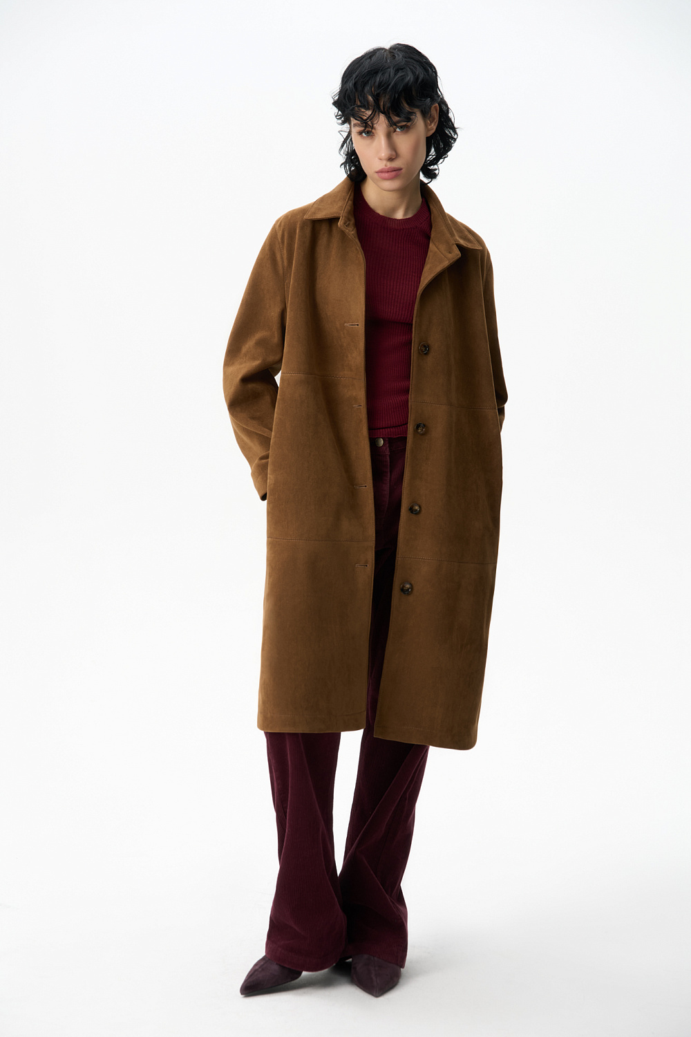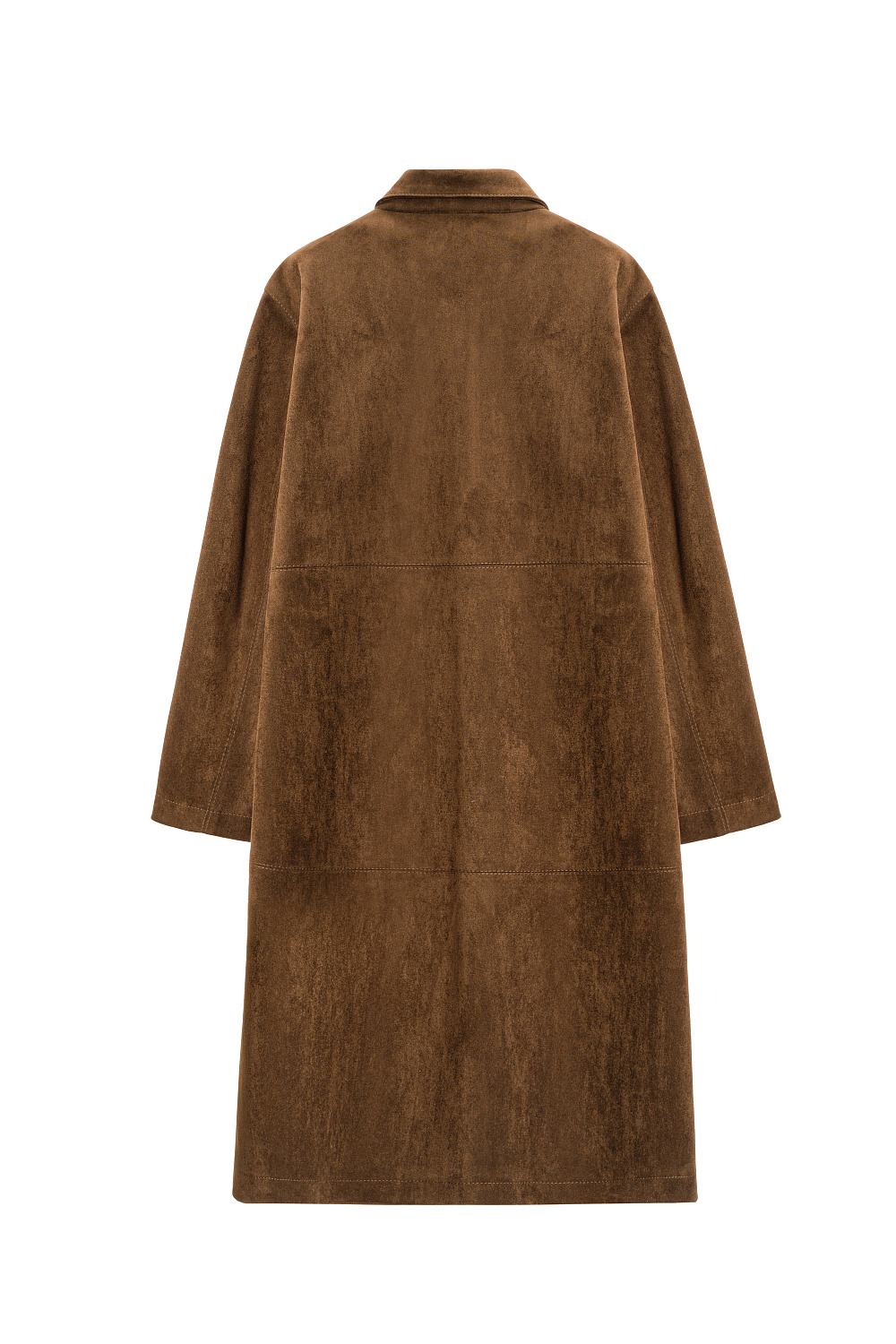 Trench coat made of fabric with an imitation of the appearance and properties of natural suede. Straight cut model with turn-down collar. Fastening with large buttons.
