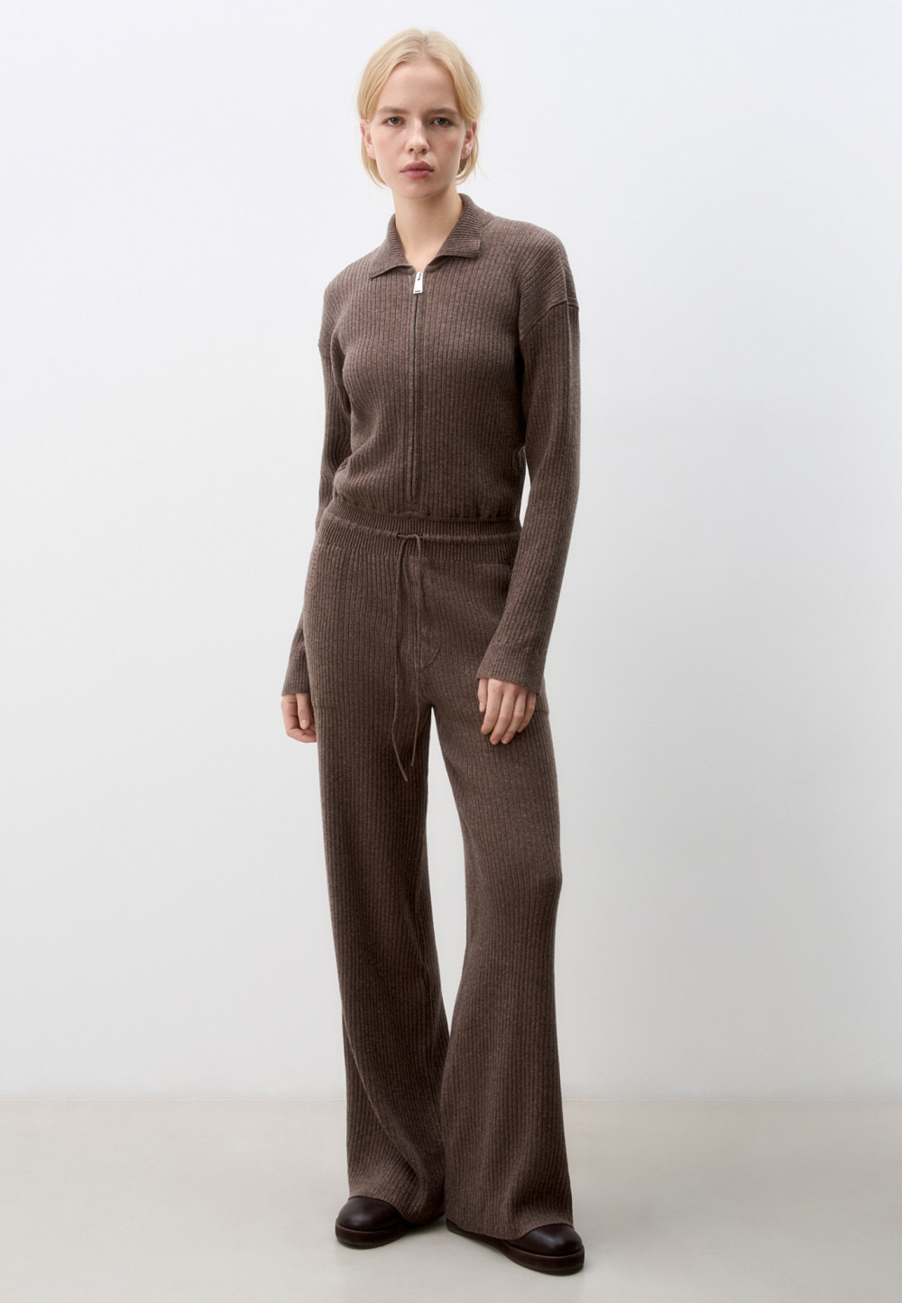 Knitted jumpsuit made of wool blend with cashmere added. Long sleeves, a drawstring waistband and a turn-down collar. Zip closure.