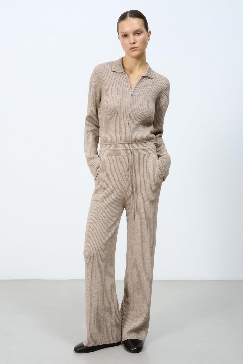 Knitted jumpsuit made of wool blend with cashmere added. Long sleeves, a drawstring waistband and a turn-down collar. Zip closure.
