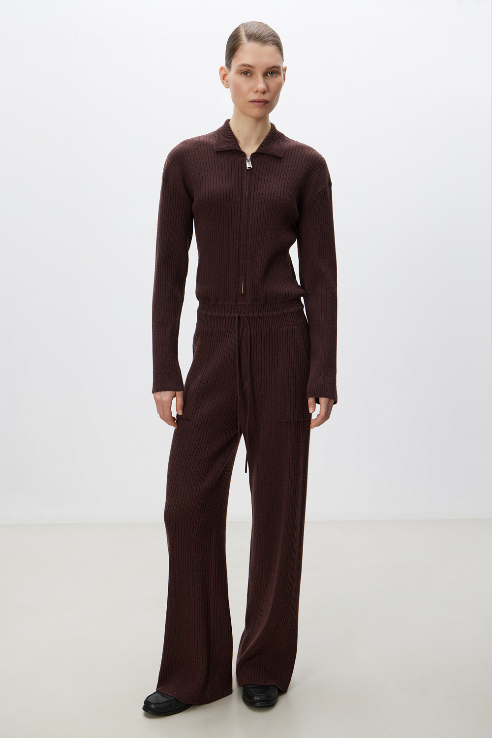 Knitted jumpsuit made of wool blend with cashmere added. Long sleeves, a drawstring waistband and a turn-down collar. Zip closure.