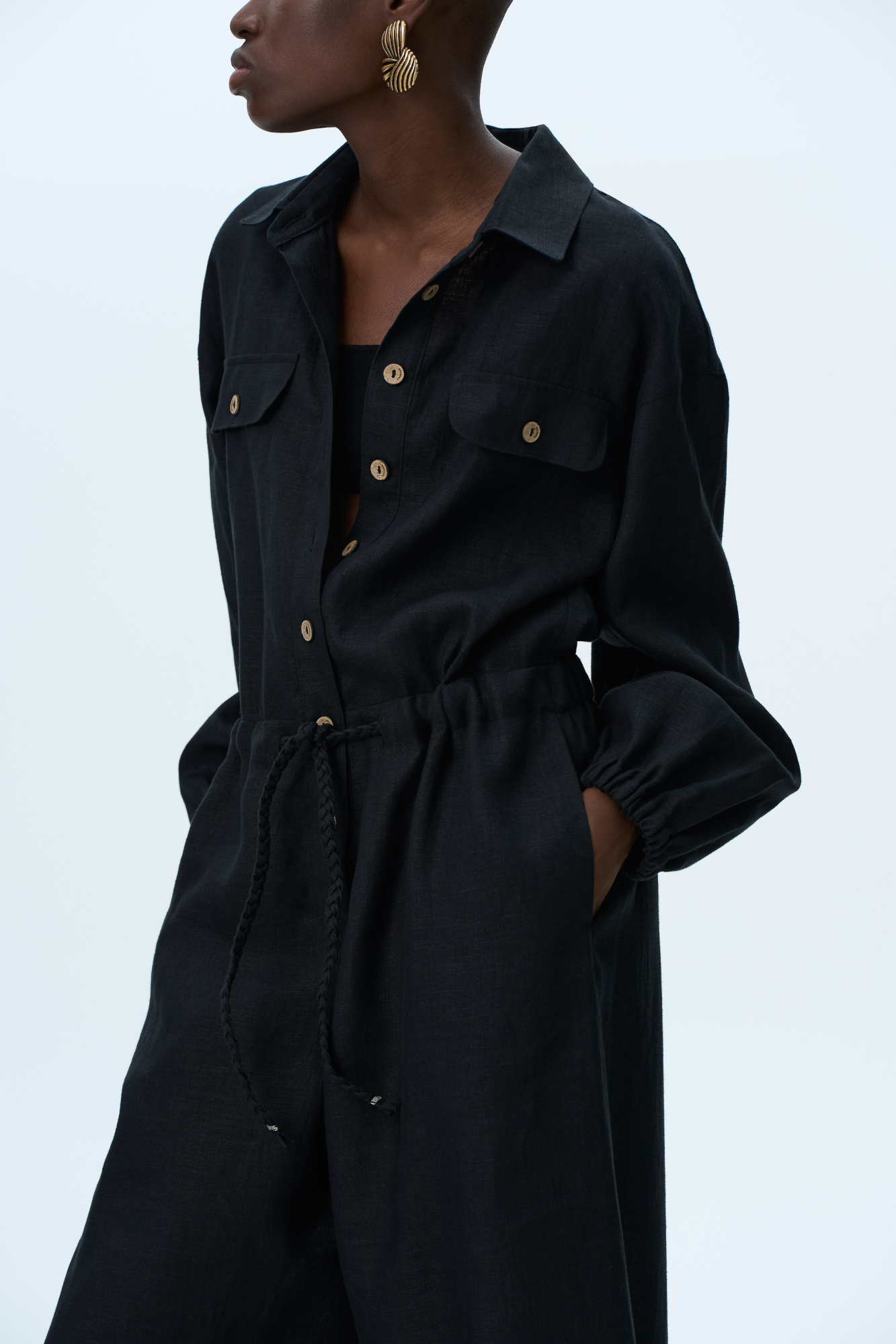 100% linen jumpsuit with patch pockets on the chest and long sleeves. Front button closure.