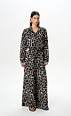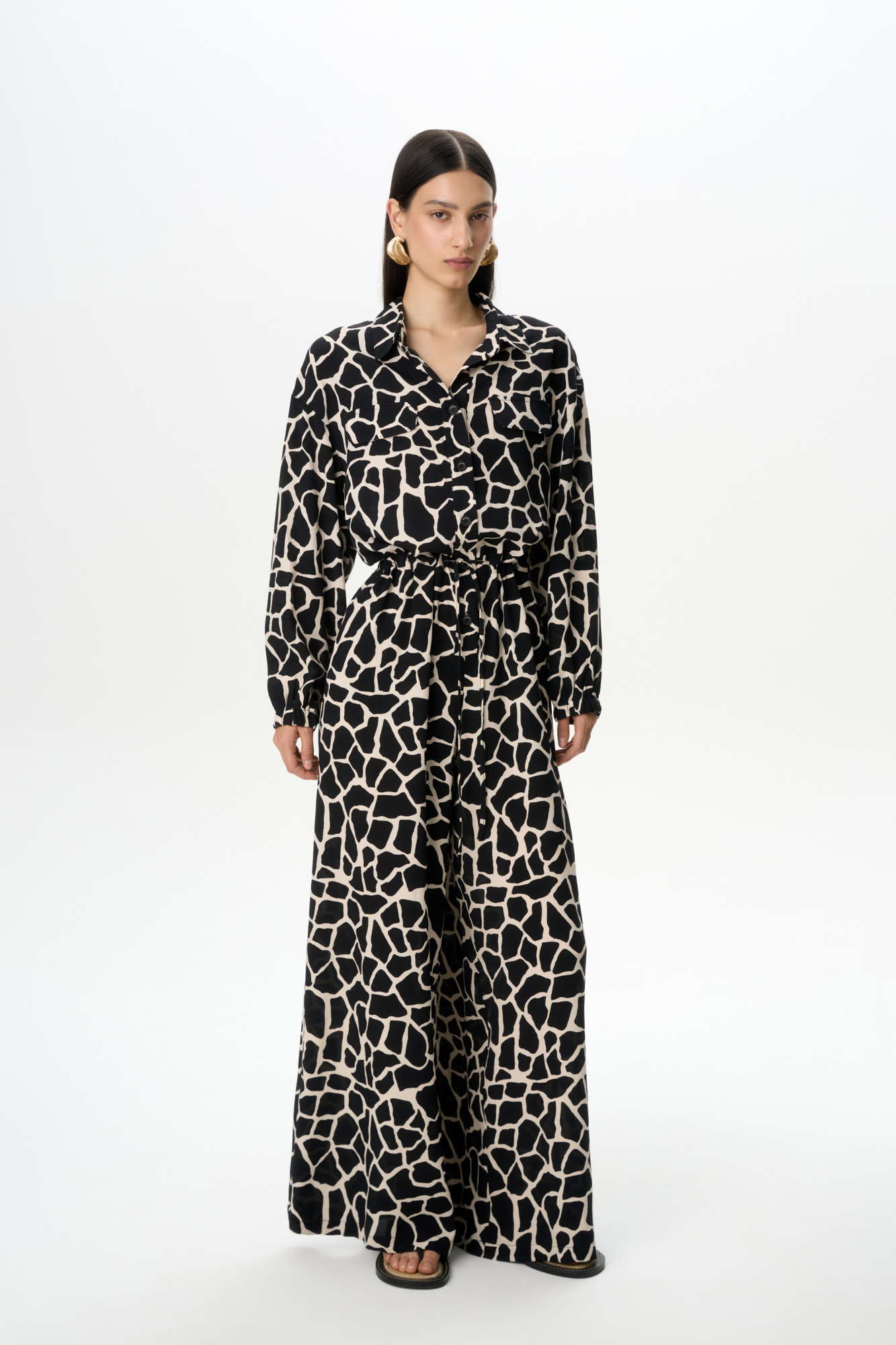 Printed jumpsuit in 100% viscose with a tie belt and button closure.