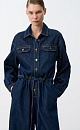 Denim overalls. Long sleeves with elasticated cuffs. Turn-down collar. Front patch pockets on the chest, side pockets and back patch pockets. Drawstring waistband. Fastening with metal buttons.