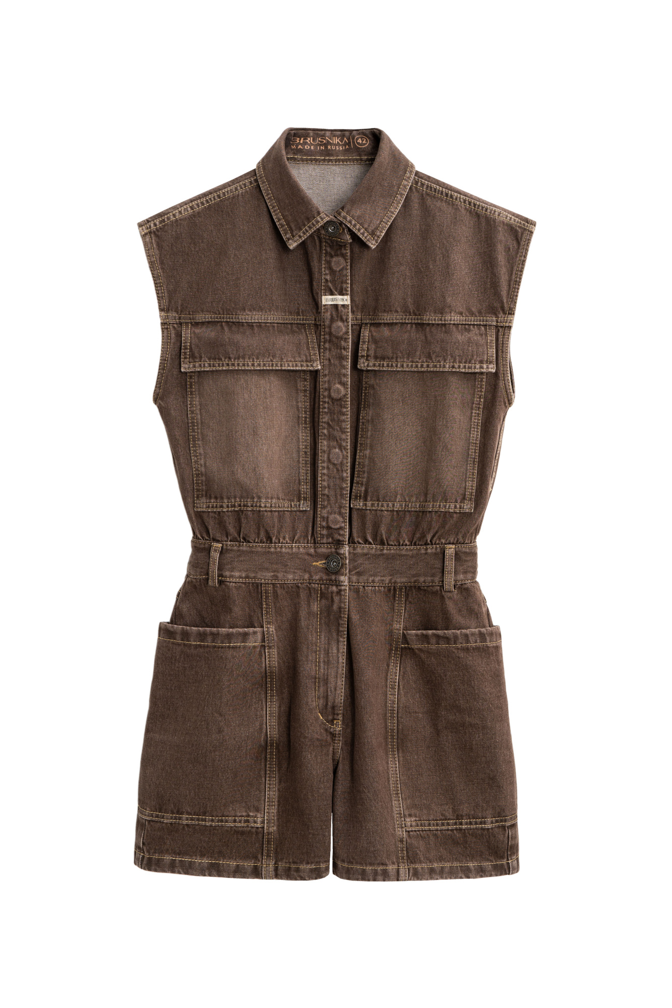 Denim overalls made of 100% cotton. Model with a shirt top and shorts. The item features a classic turn-down collar, short cap sleeves and a metal button closure, belt loops and large patch pockets.
