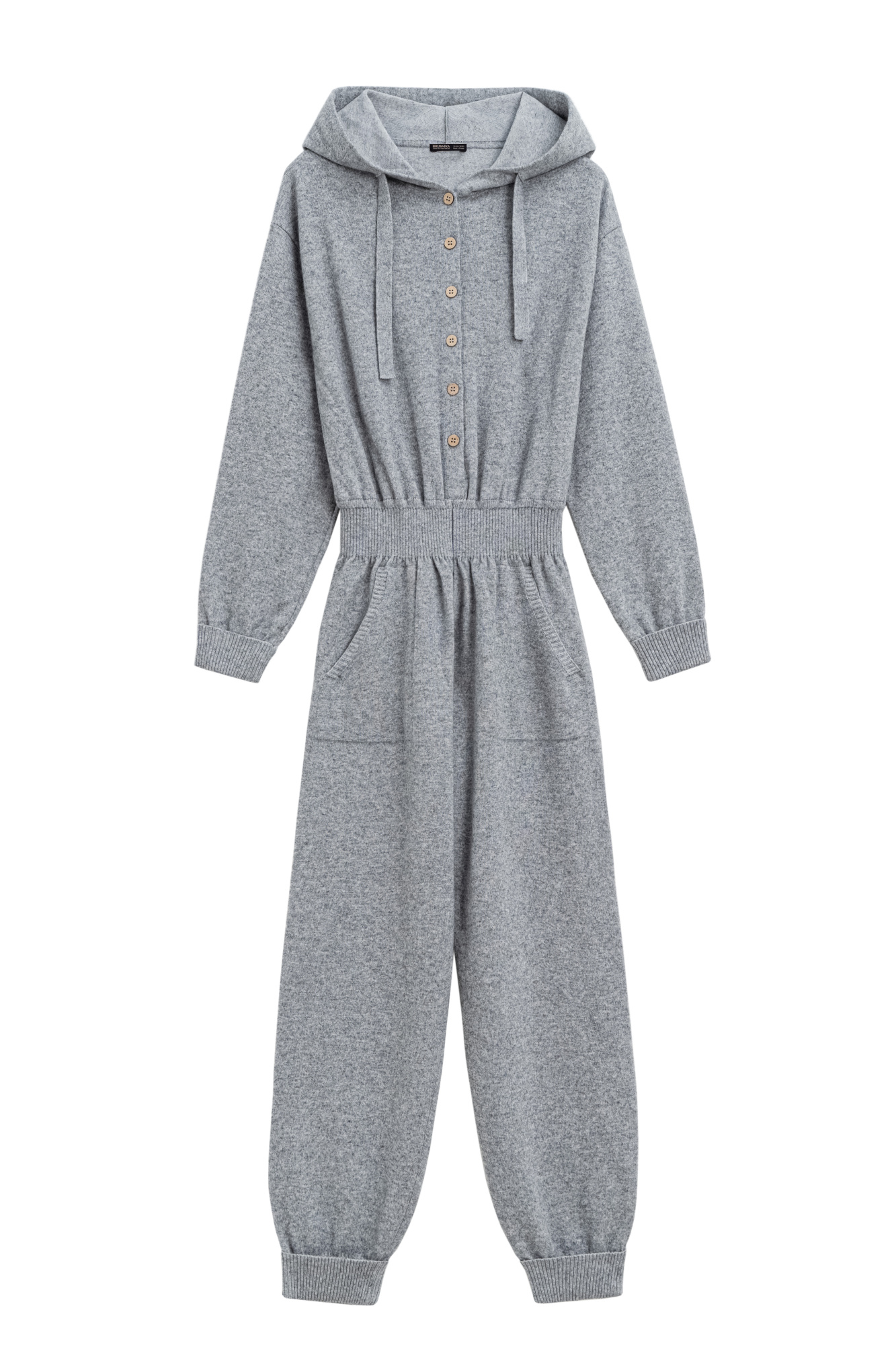 Knitted overalls made of wool and cashmere, consisting of a hoodie and trousers. Hoodie with a hood and button fastening, trousers with a wide elastic waistband, side pockets and elasticated cuffs.