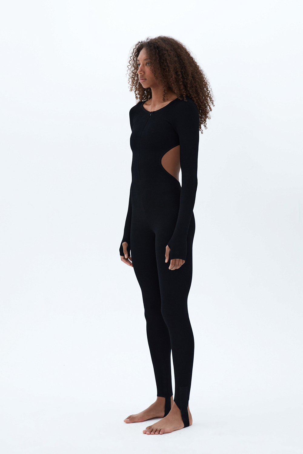 Knitted viscose jumpsuit with a cut-out back, zip fastening and long sleeves with thumb holes at the cuffs.