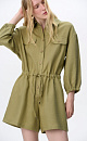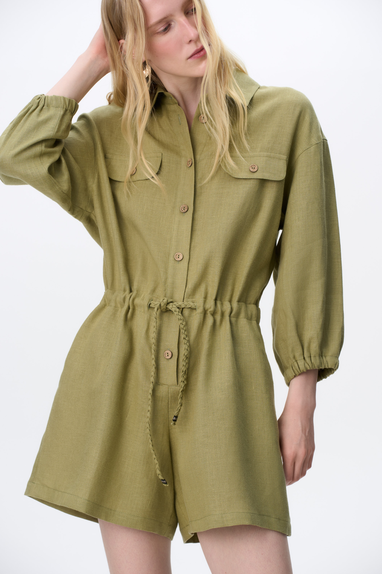 100% linen jumpsuit with patch pockets on the chest, long sleeves and an adjustable drawstring at the waist. Front button closure.