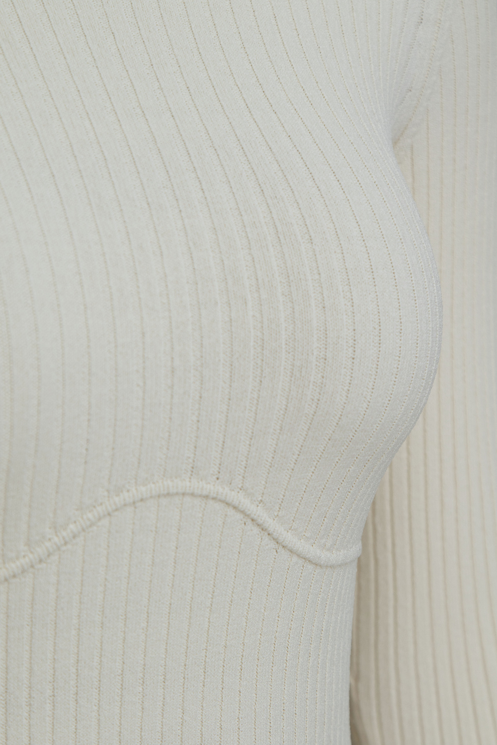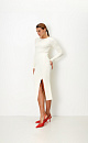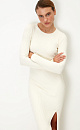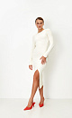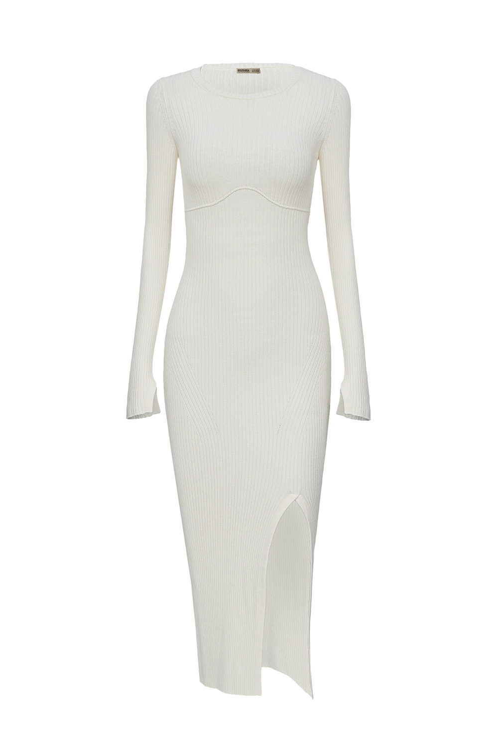Knitted soft viscose dress with long sleeves. Features decorative piping under the chest and side slit.