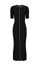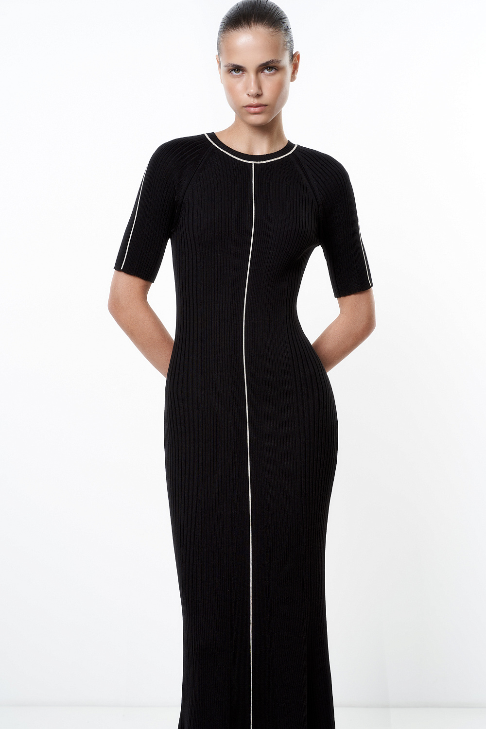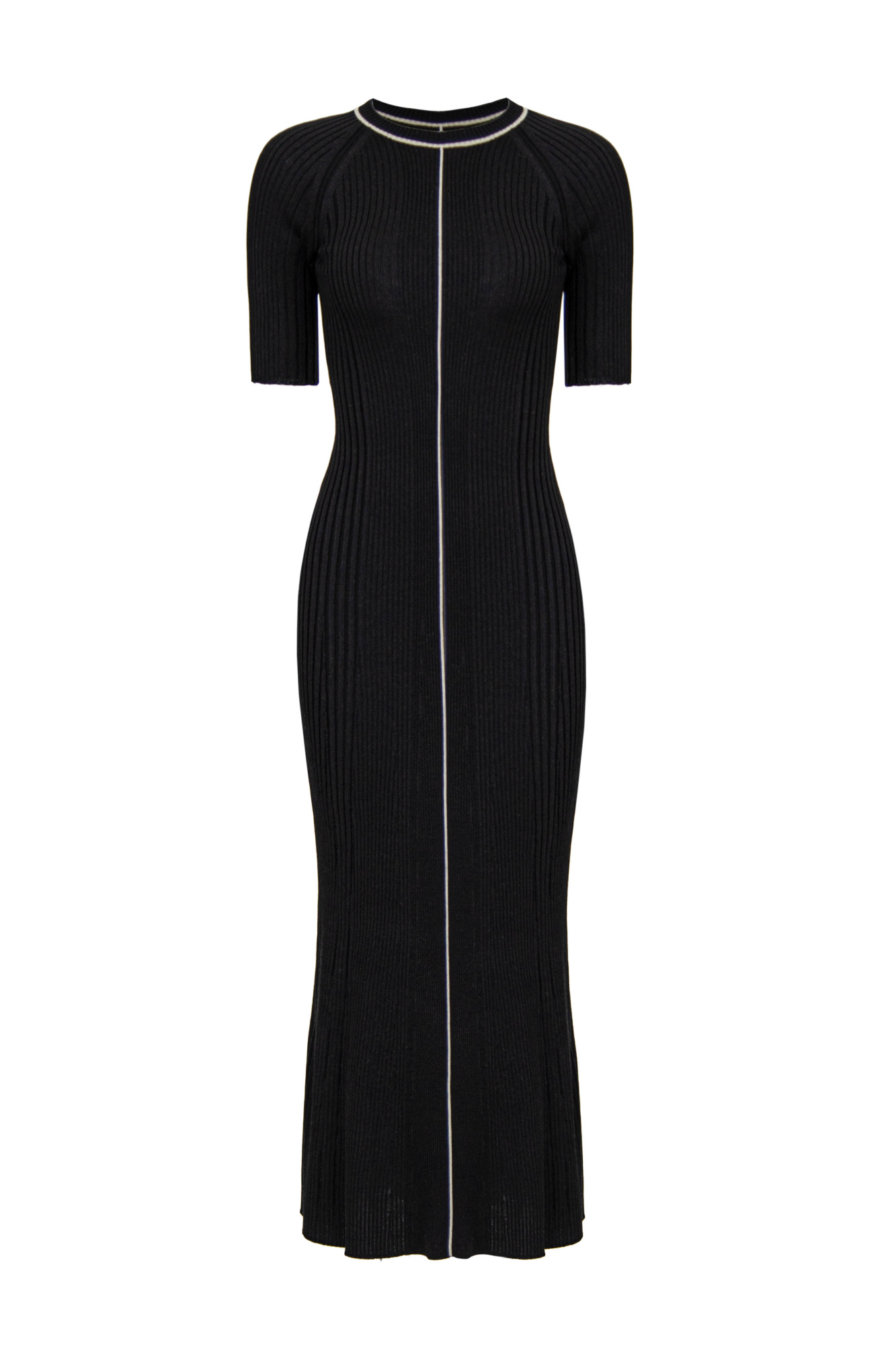 Knitted merino wool maxi dress. Features short sleeves, a contrast stripe in the middle and ribbed fitted silhouette.