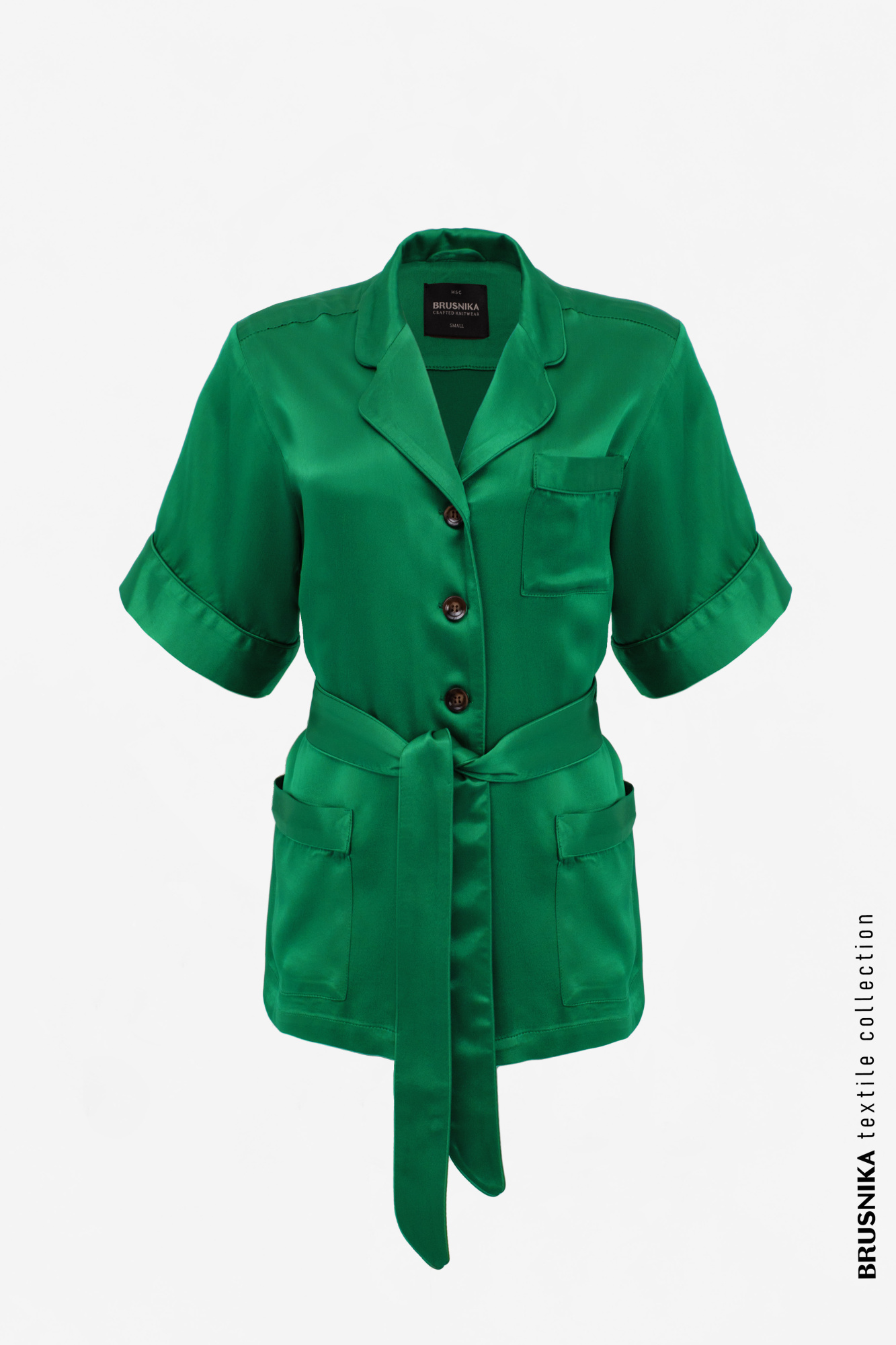 Satin button-down shirt with belt, short sleeves and patch pockets. You can complement the look with shorts made of the same material.
