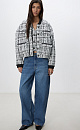 Knitted jacket made of textured tweed. Model with a stand-up collar, accent buttons and imitation pockets. The sleeve cuffs are made with elastic. The product is decorated with lurex, sequins and beads.