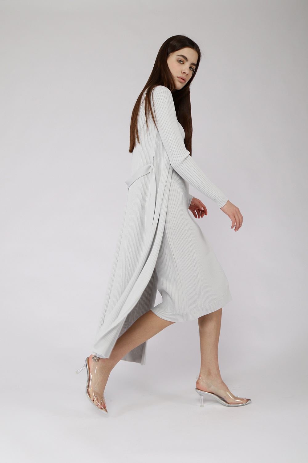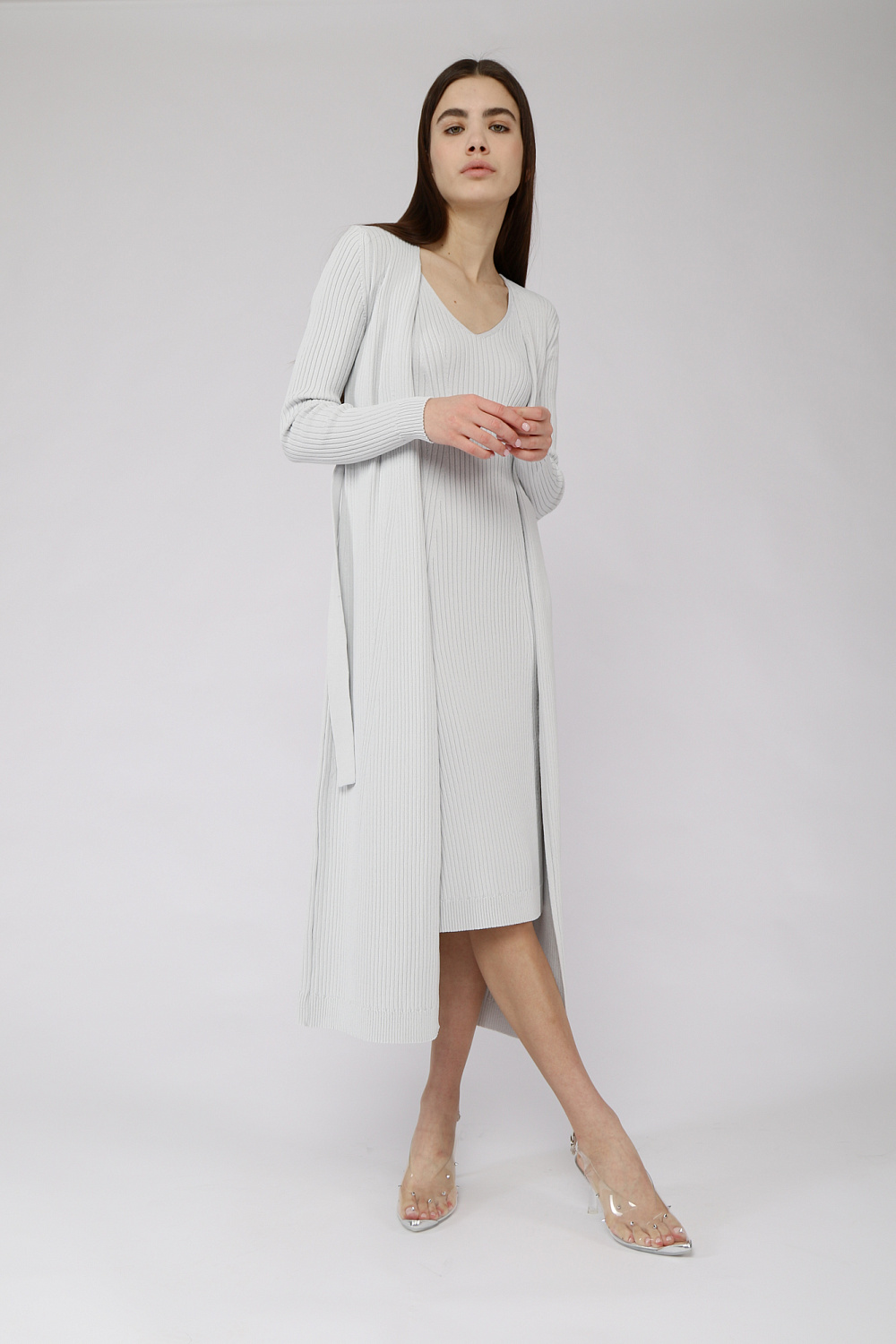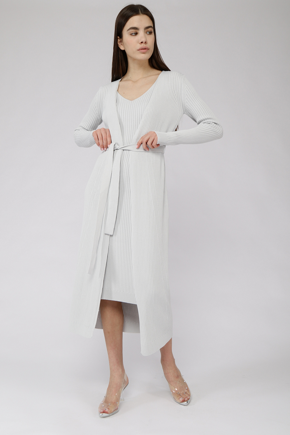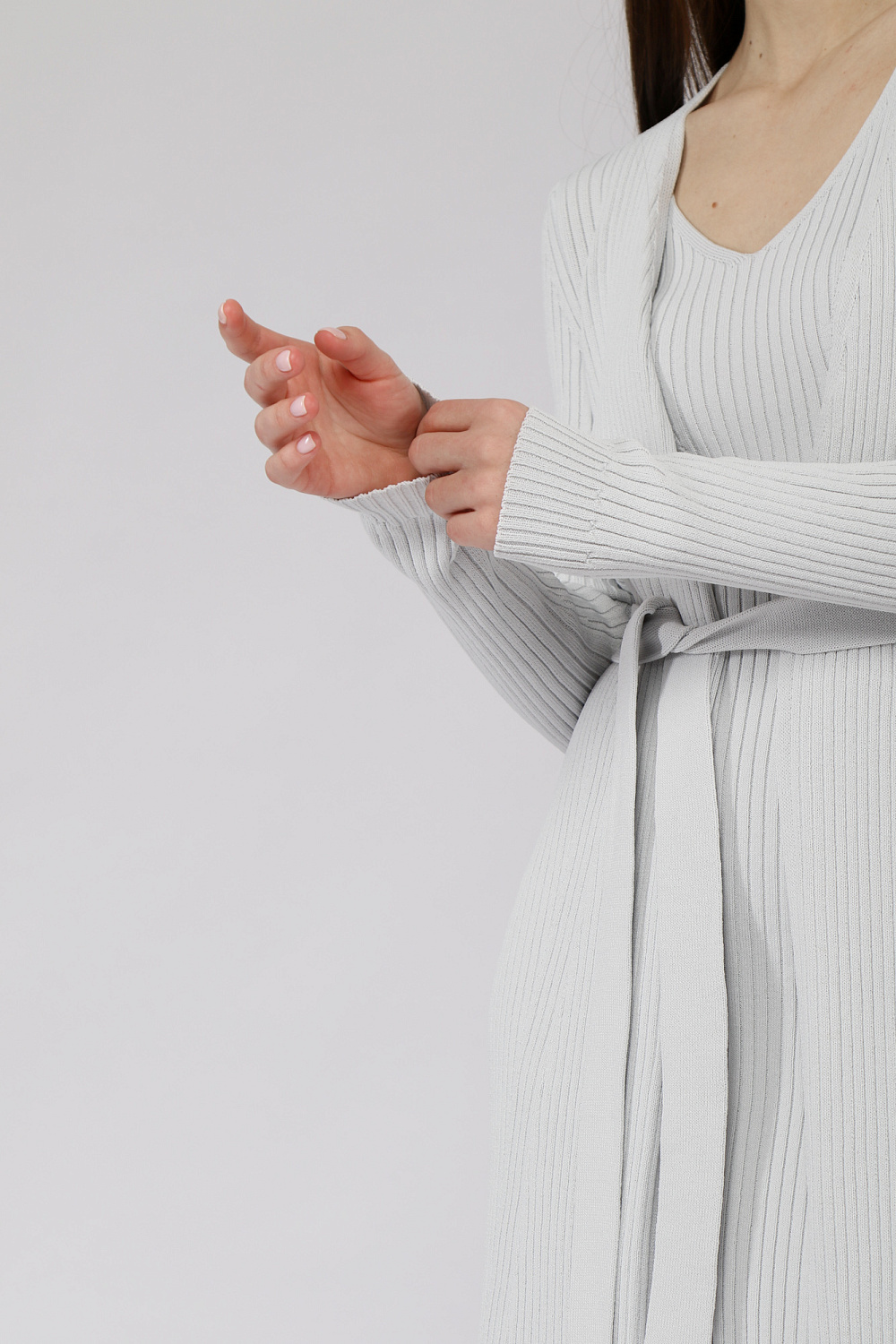 A light cardigan of a fitted silhouette with a belt and long sleeves.