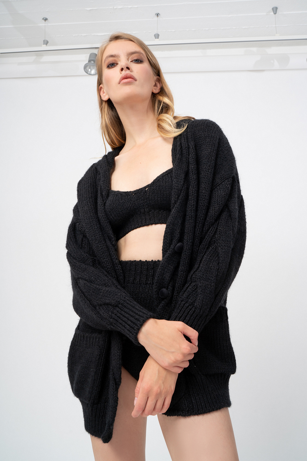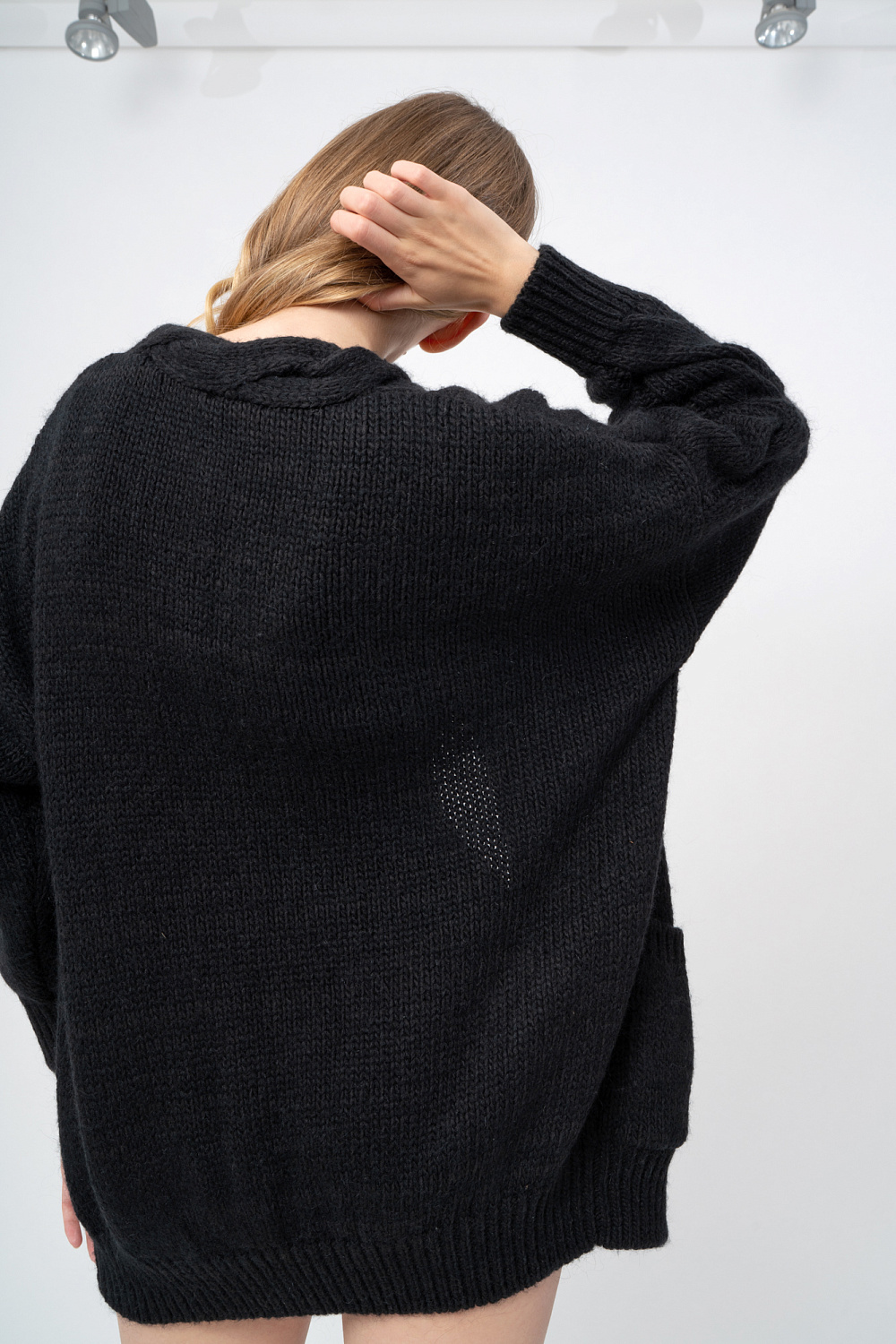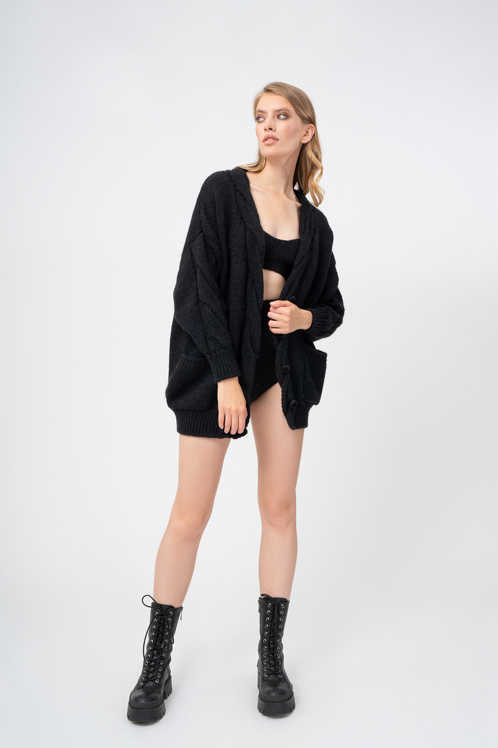 The volumetric cardigan of textured knitting "braids" on buttons with pockets.