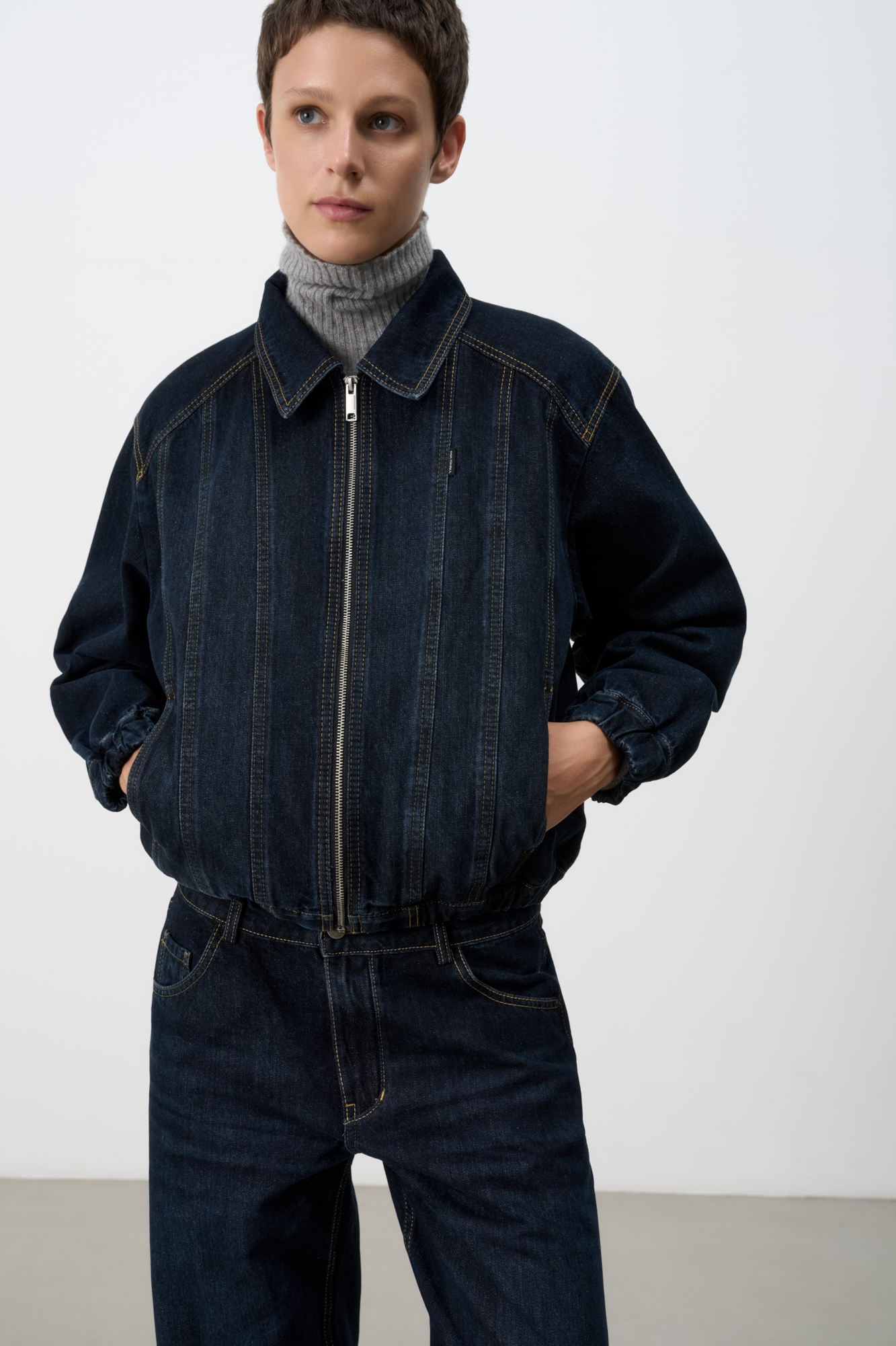 Denim bomber jacket with elasticated cuffs. Loose silhouette model with dropped shoulder line. Concealed side pockets, zip fastening.