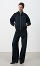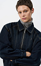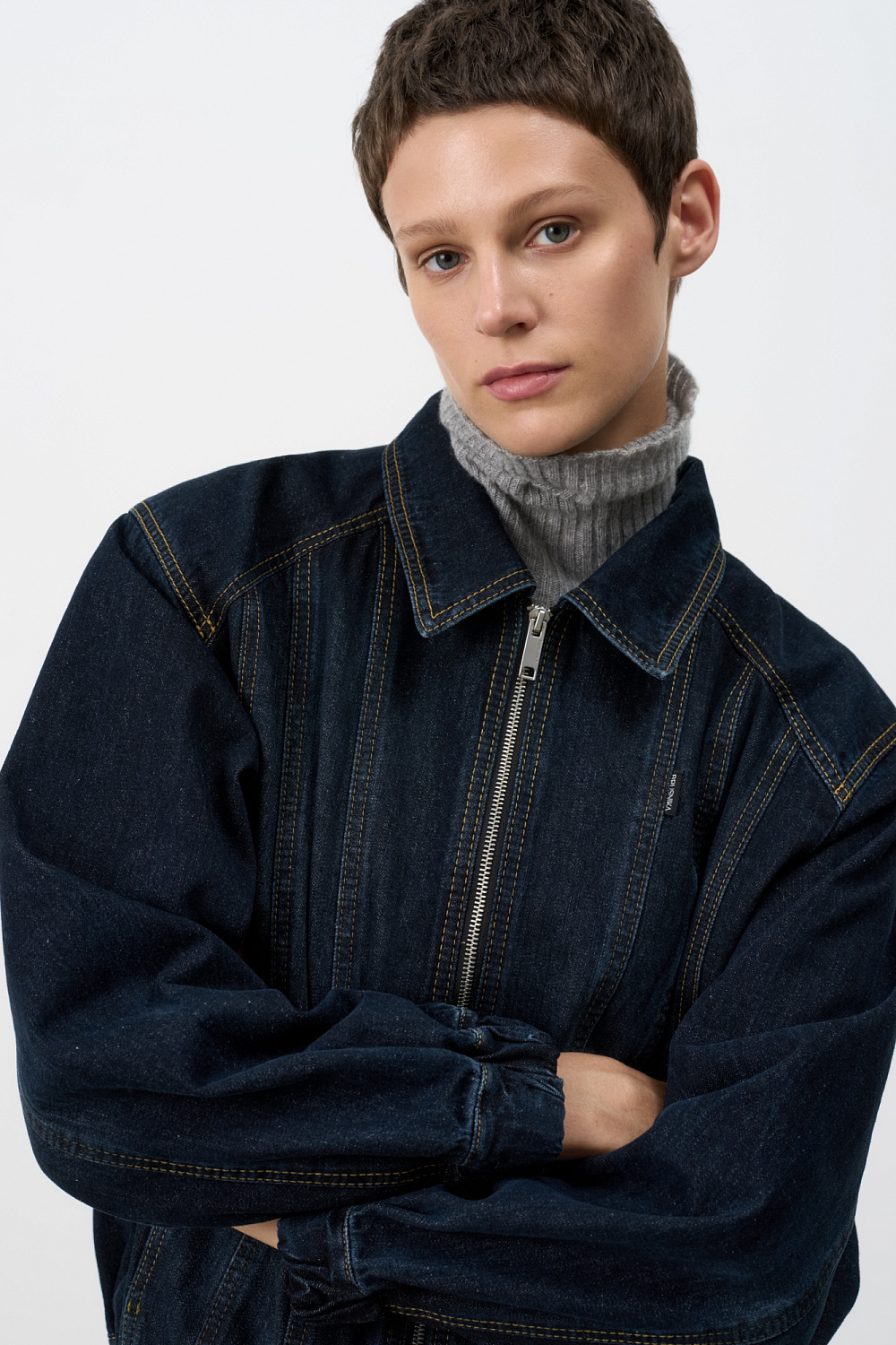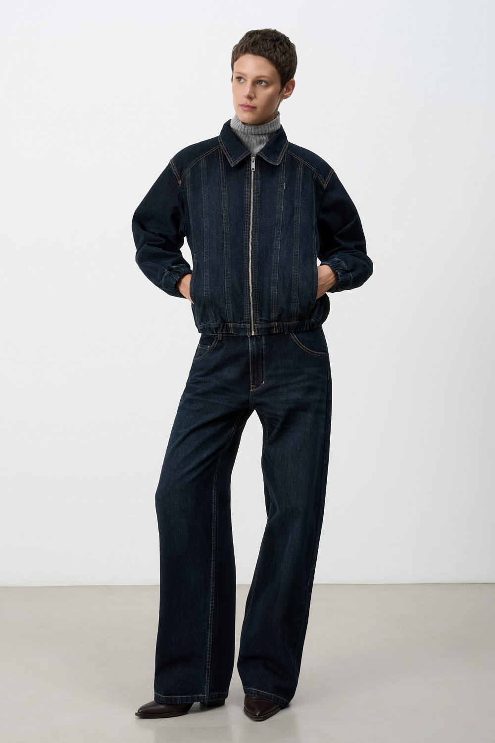 Denim bomber jacket with elasticated cuffs. Loose silhouette model with dropped shoulder line. Concealed side pockets, zip fastening.