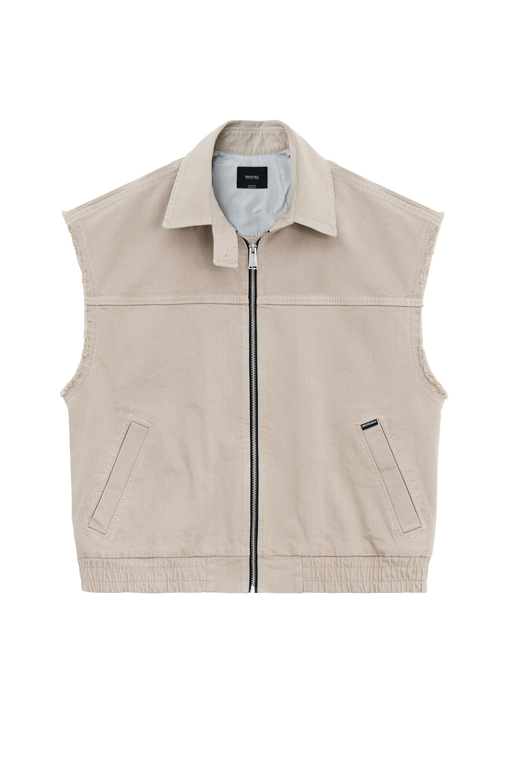 Denim vest with raw edges. Loose silhouette with side pockets and branded label. Zip closure. You can complement the look with jeans in the same style.