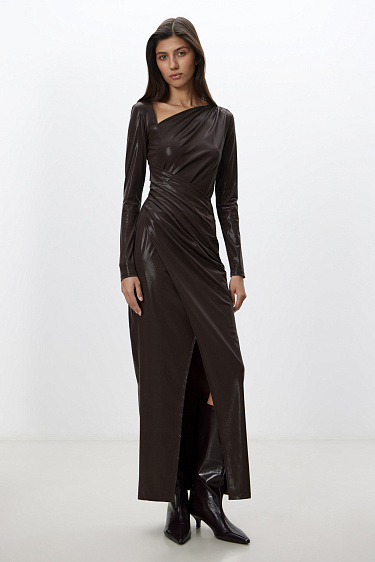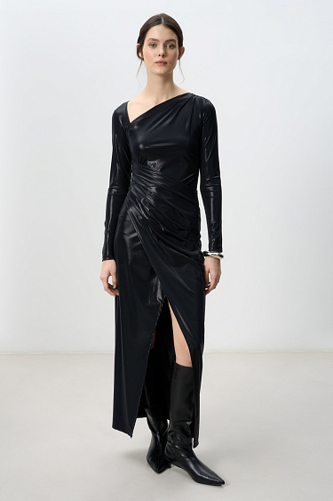 Maxi dress with an asymmetrical neckline and draping