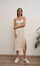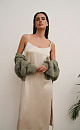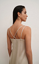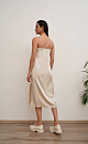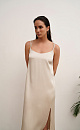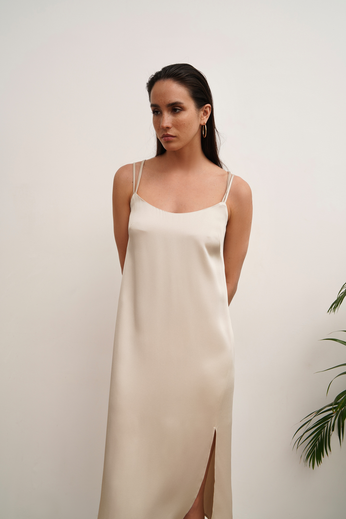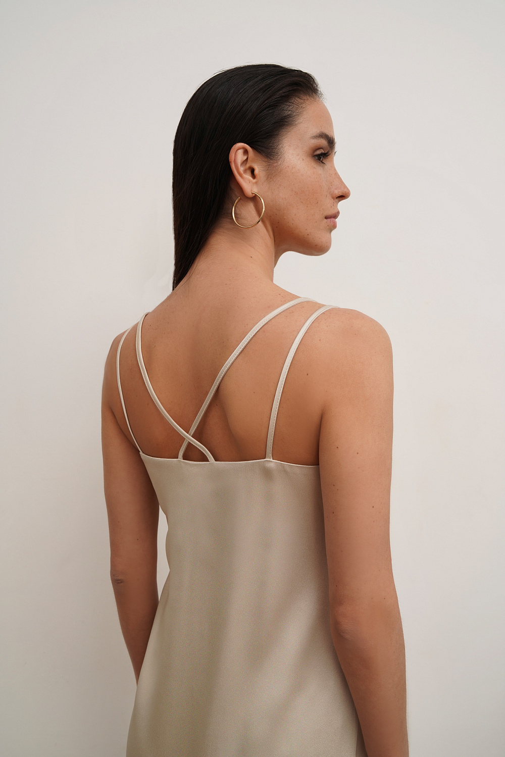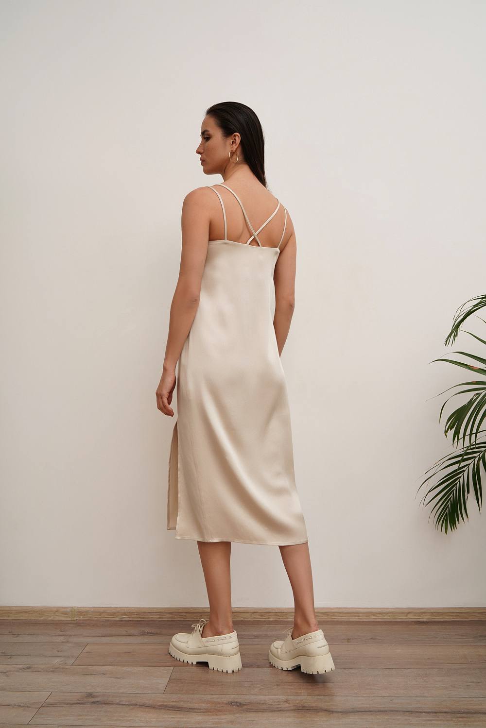 A satin slip dress made of 100% viscose will harmoniously fit into both daytime and evening looks. Thin cross straps and a side slit reveal femininity and elegance.