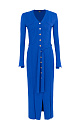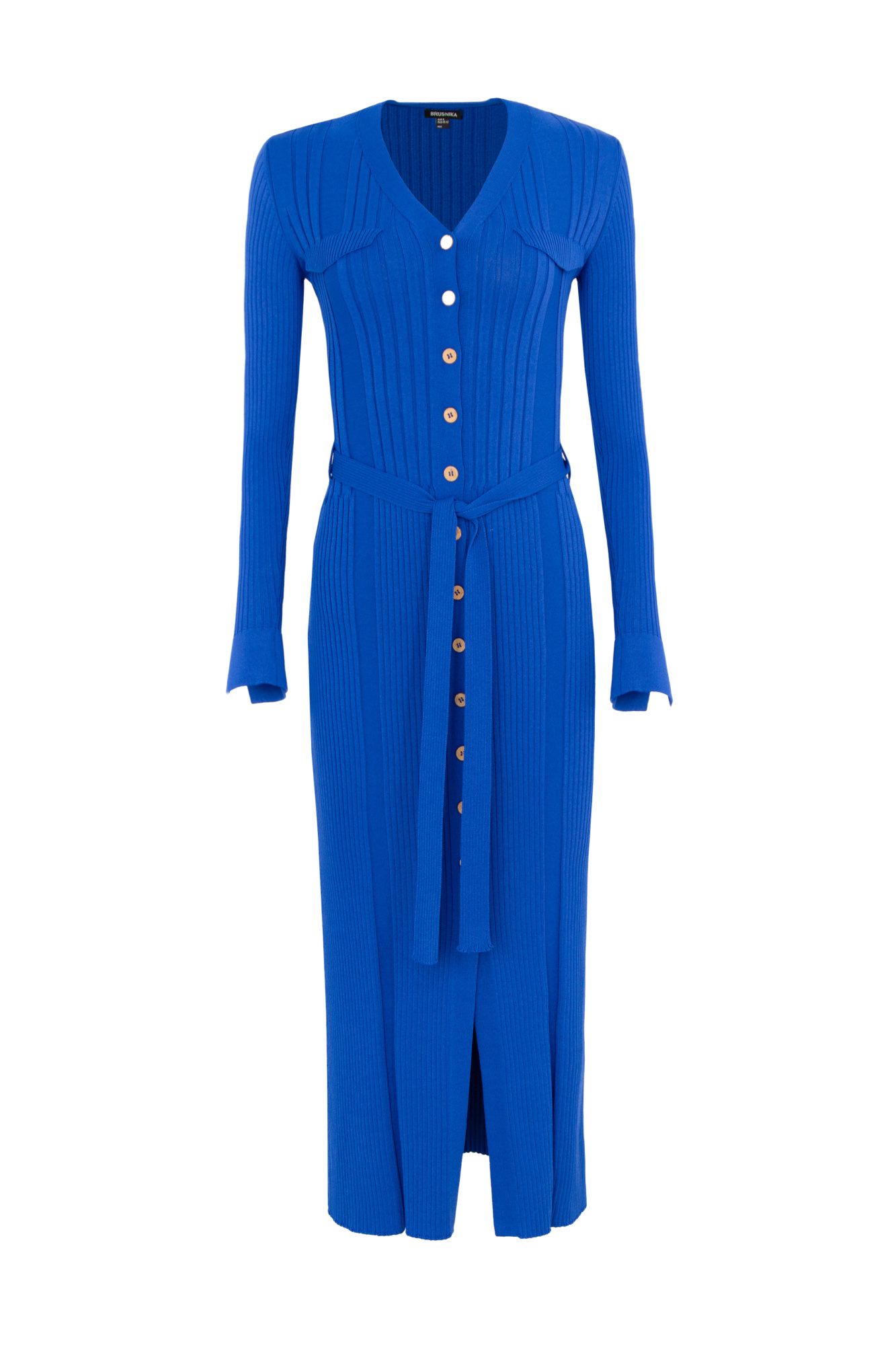 Wide ribbed knitted viscose dress with belt. Long cuffs with a slit, patch pockets on the chest, button closure. The dress can be used as a cardigan.