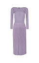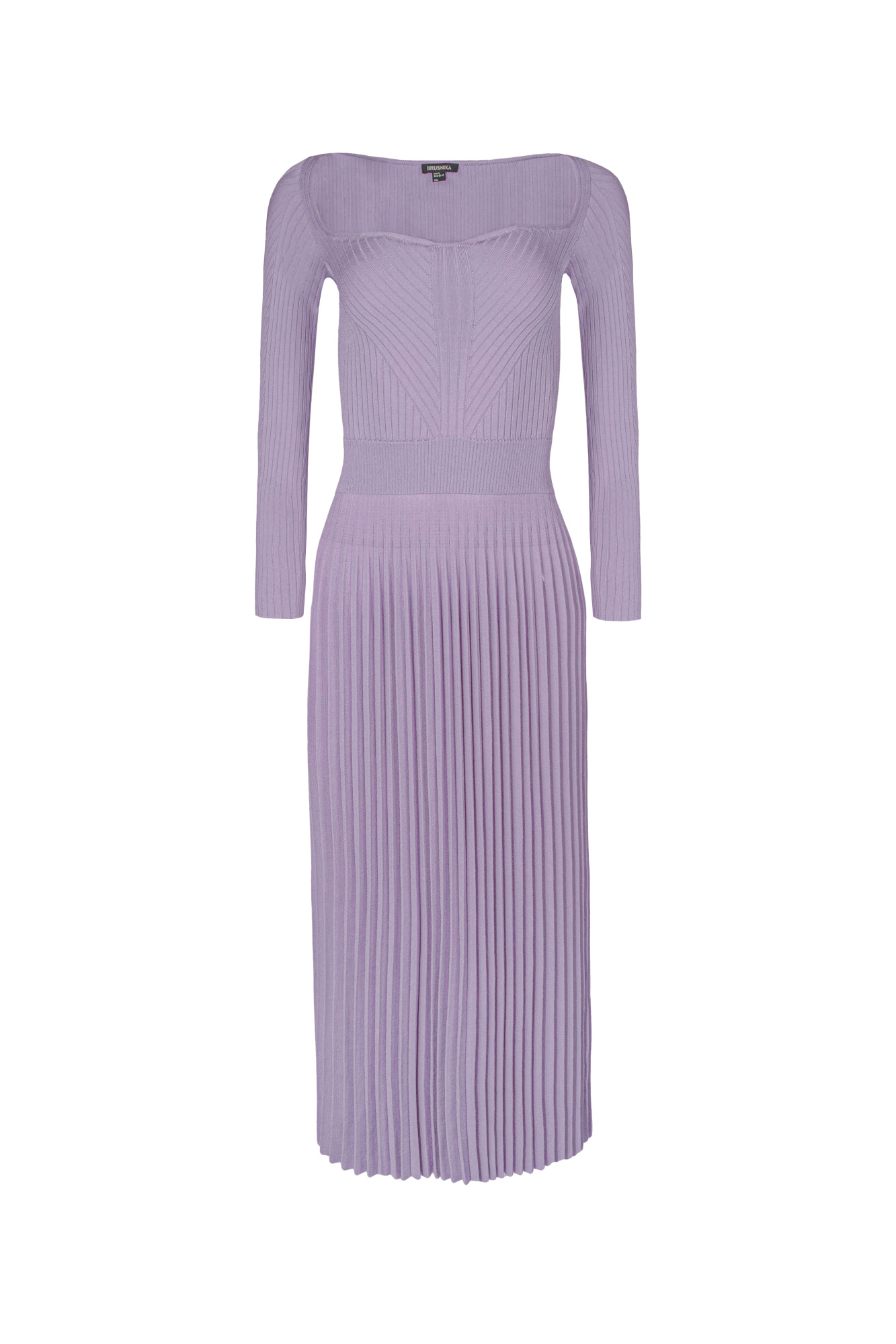 Knitted viscose dress with a pleated skirt and long sleeves. Features figured neckline and and elasticated waist.