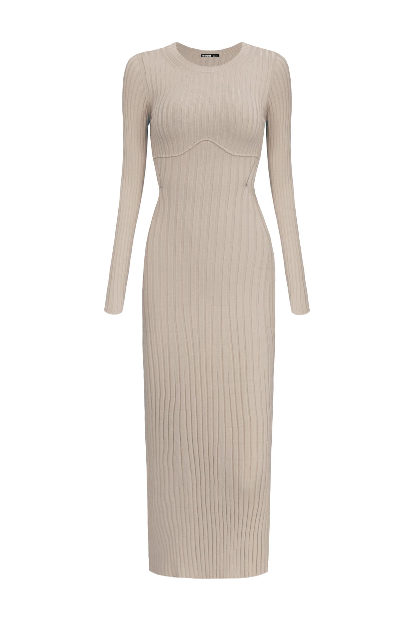 Knitted dress with an open back. Round neckline and long sleeves.