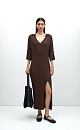 Elegant ribbed knit dress with polo collar and front slit. 3/4 length sleeves.