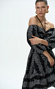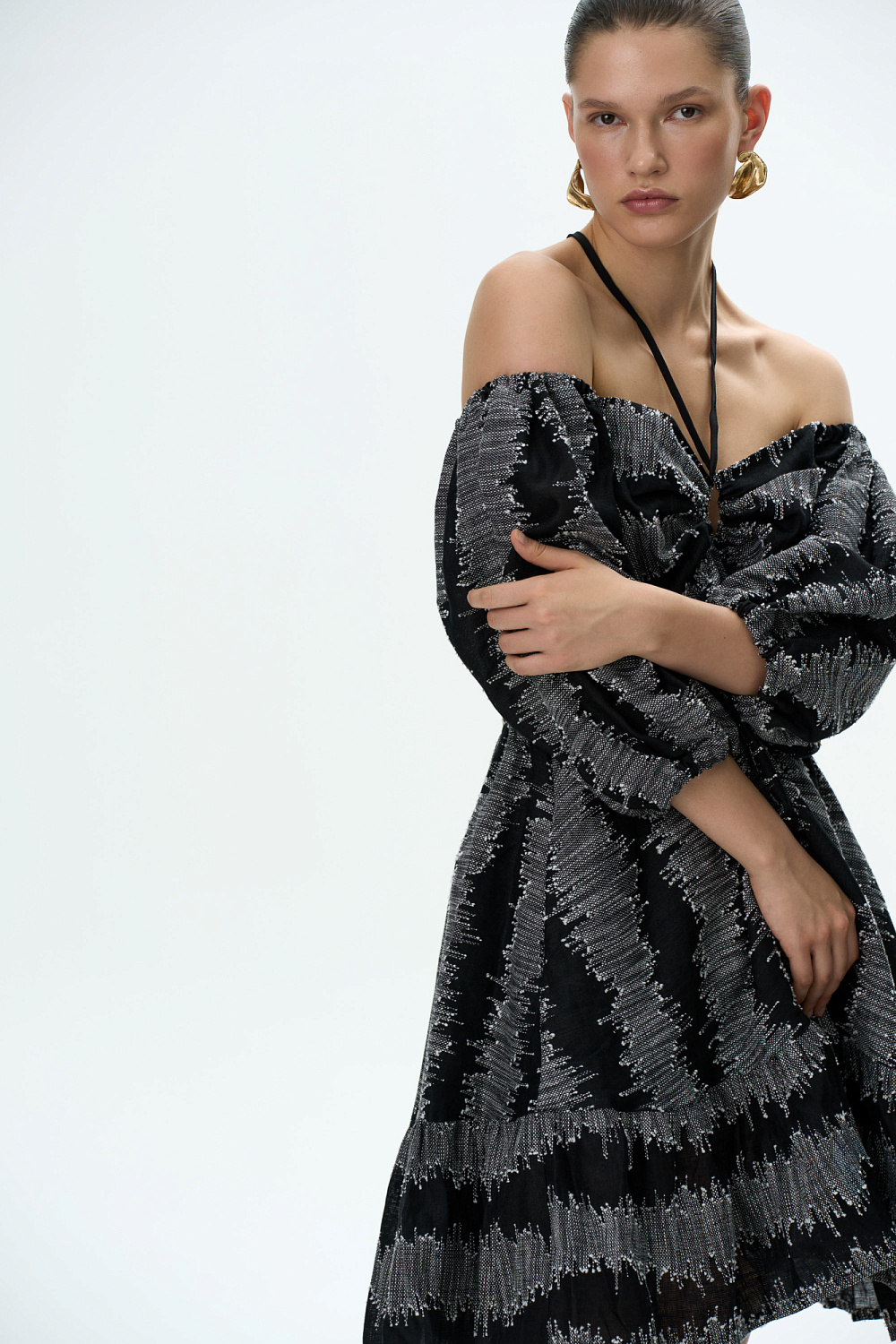 100% linen dress with open shoulders and semi-sweetheart neckline.
