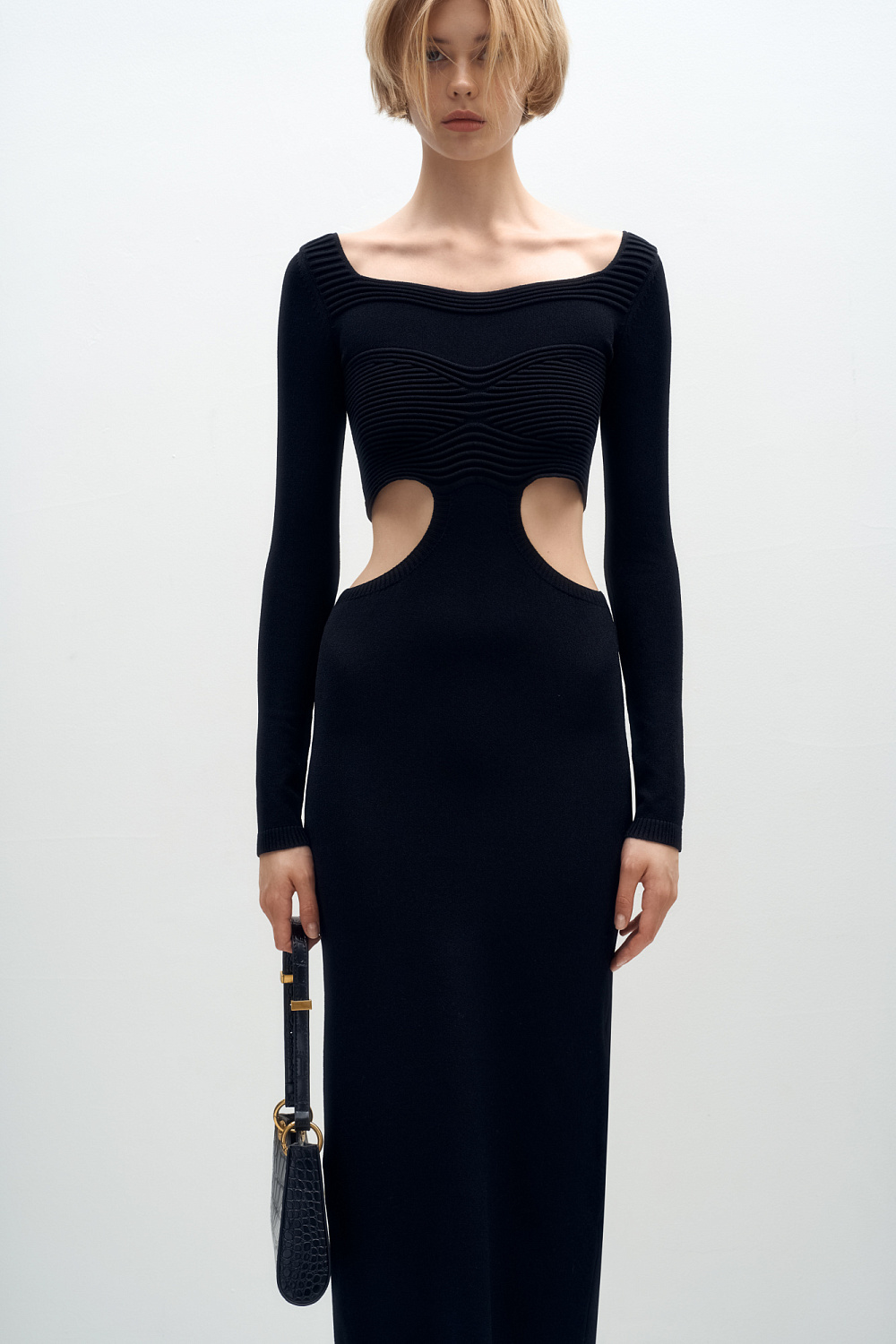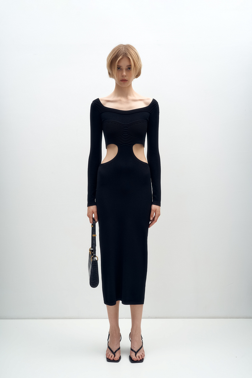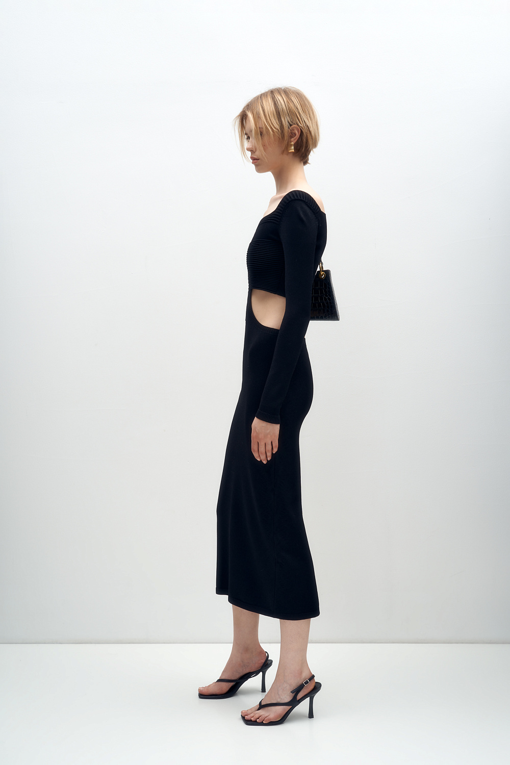 Knitted fitted viscose midi dress. Cutouts at the waist and open back.