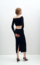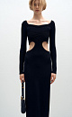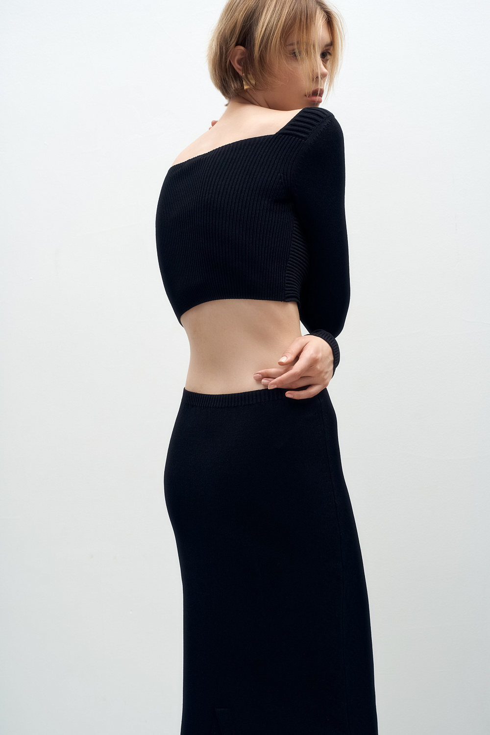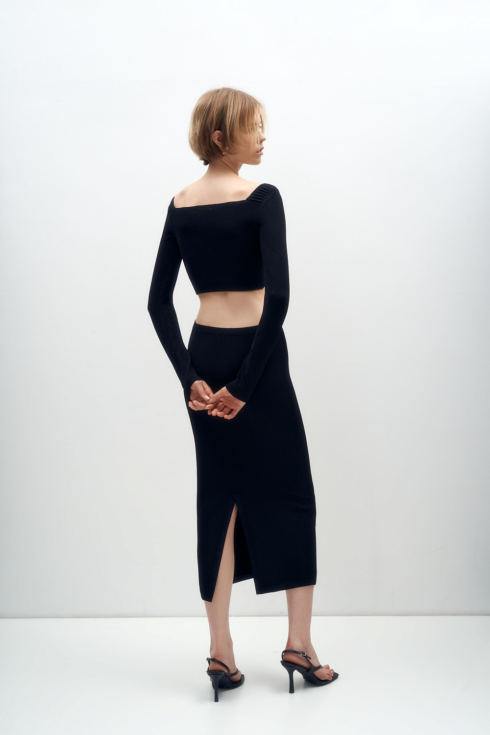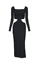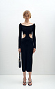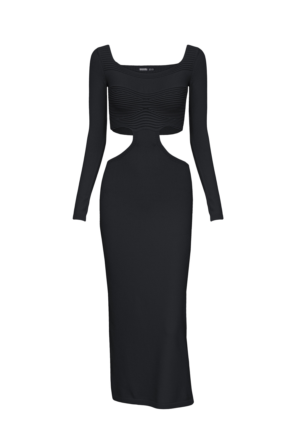 Knitted fitted viscose midi dress. Cutouts at the waist and open back.