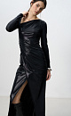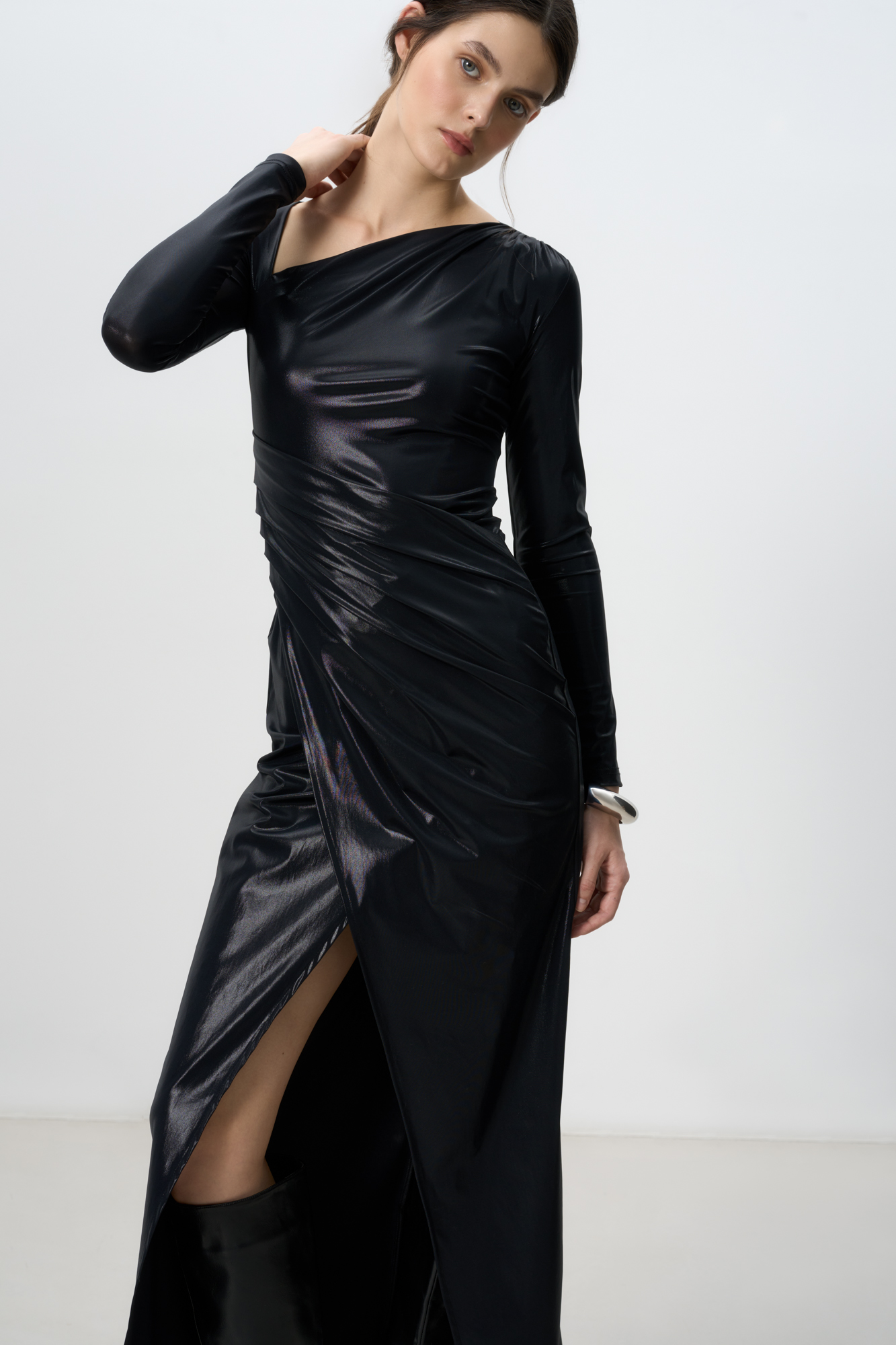 Maxi length dress with asymmetrical neckline and draping. Fitted silhouette with long sleeves and a front slit.