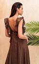 Maxi-length linen sundress with an open back with a slit and ruffles on the sleeves and skirt.