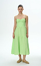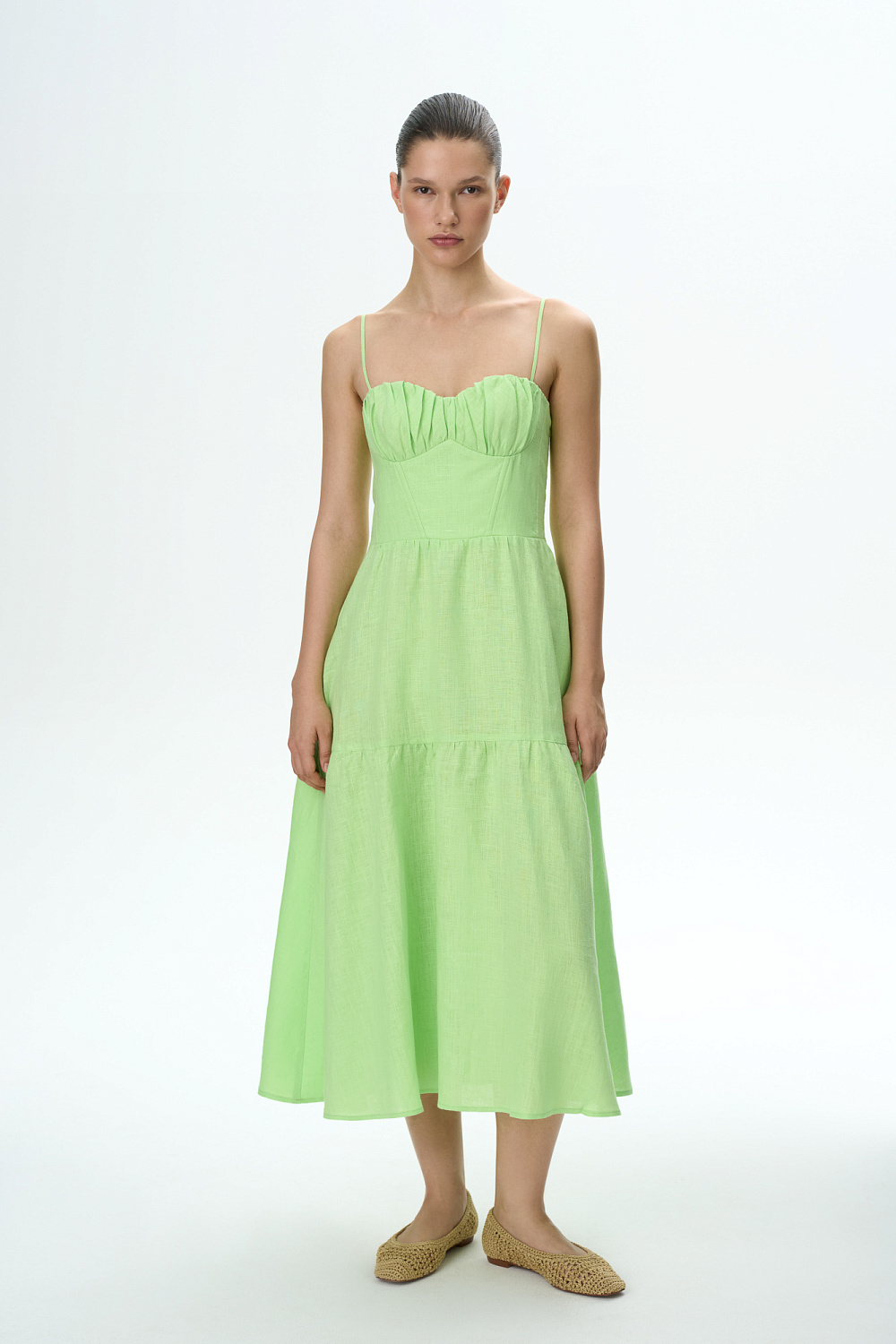 Sundress made of 100% linen. Model with thin adjustable straps. The bodice has sewn-in cups and is decorated with drapery. The top of the sundress is made in the style of a corset with an elastic band on the back.