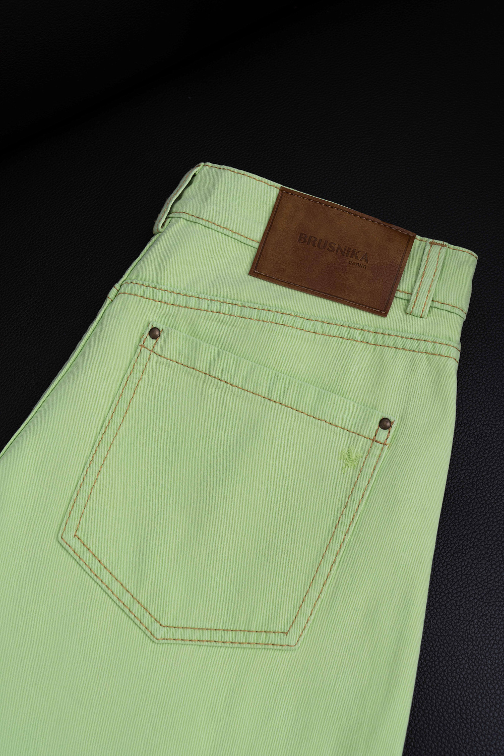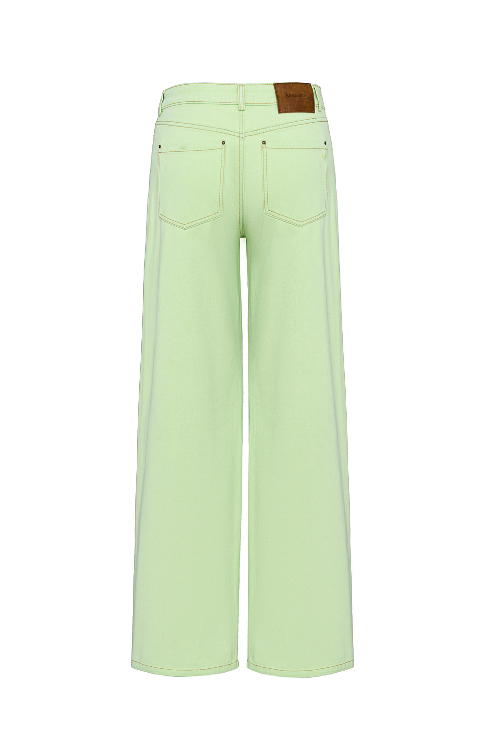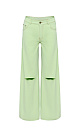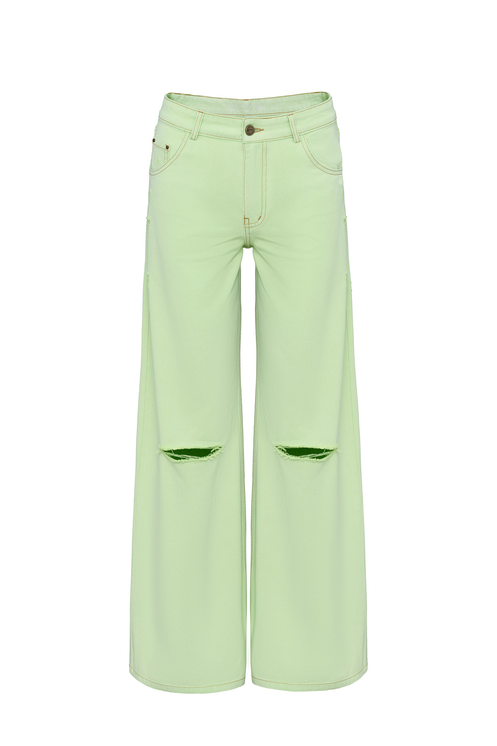 Flared jeans with slits at the knees. Relaxed silhouette, five pockets. Zip and button closure.