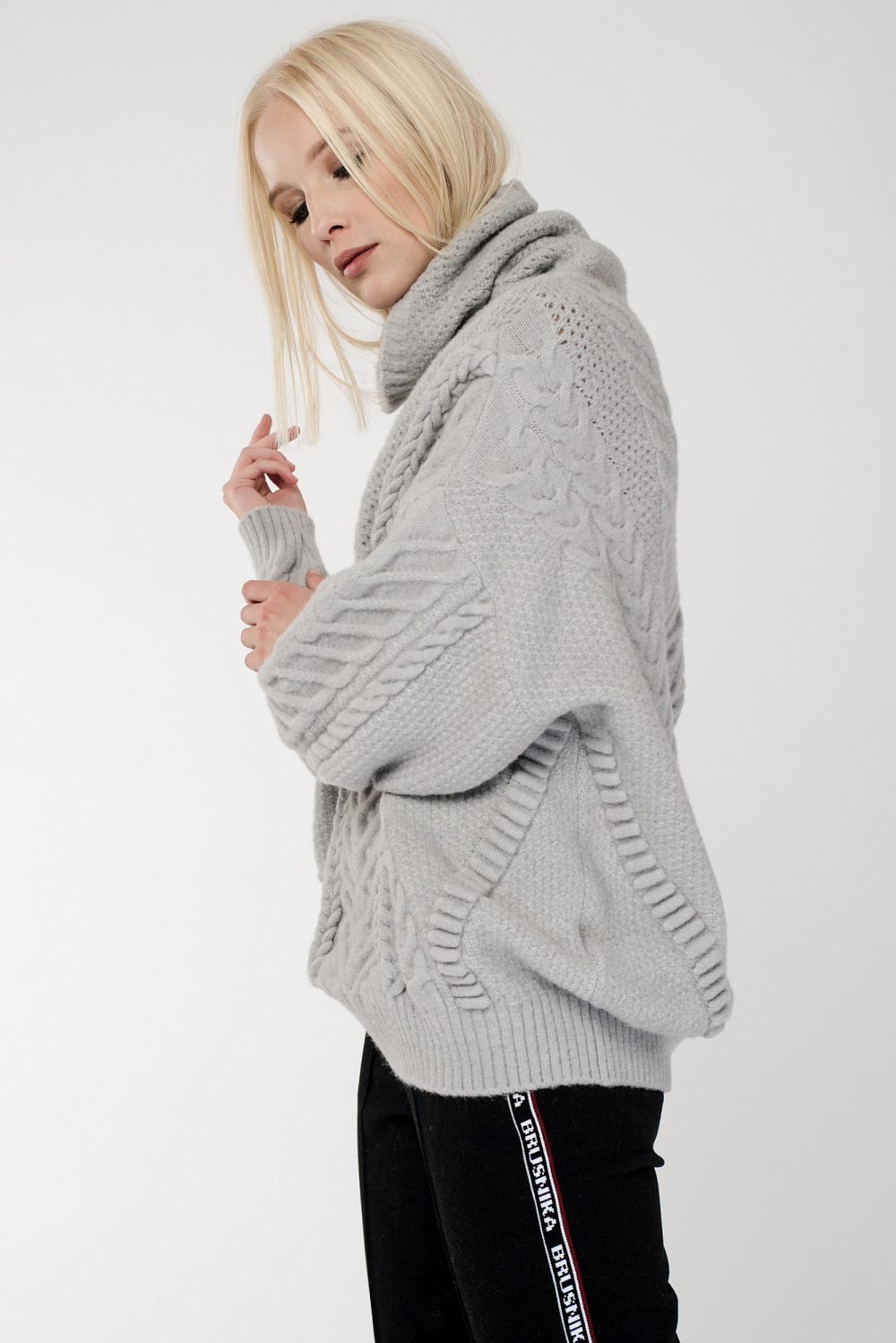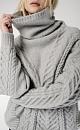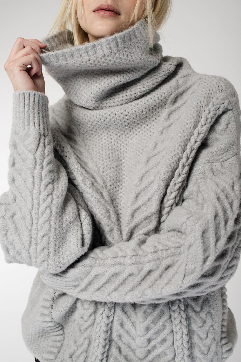 Cozy, voluminous jumper with braids. High throat. Low shoulder line.