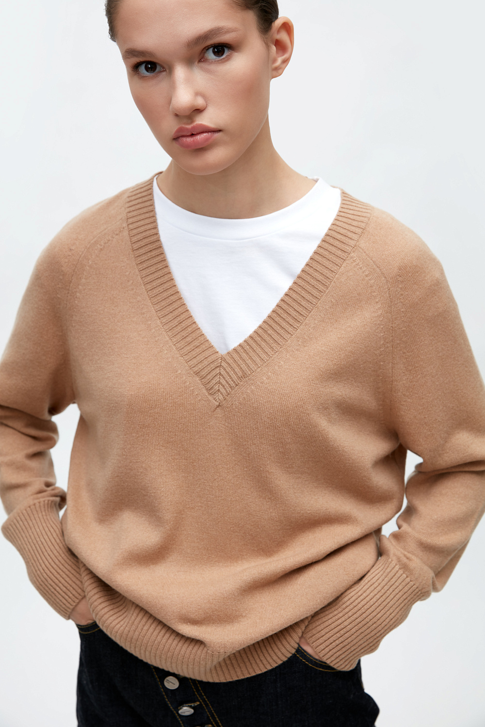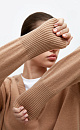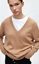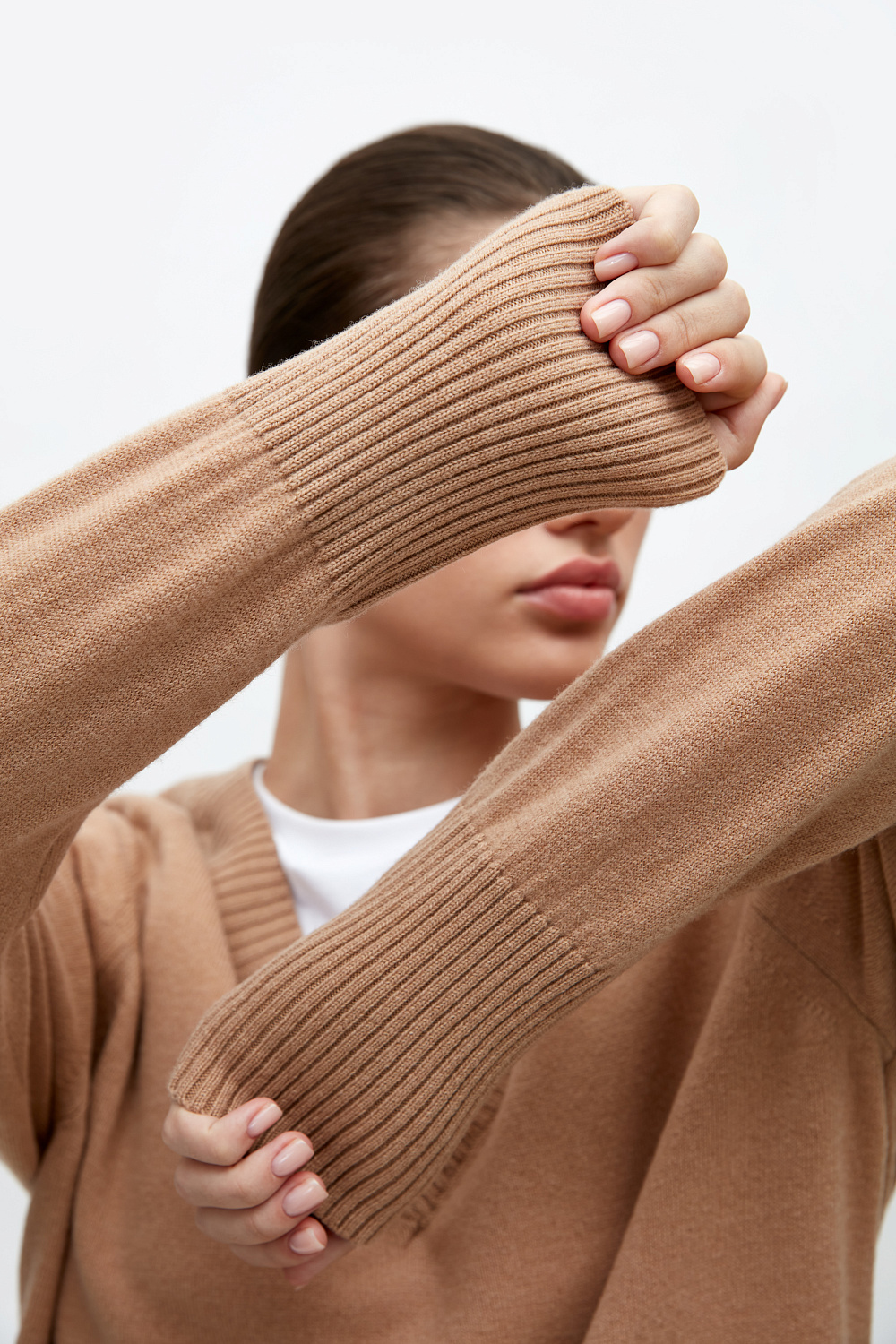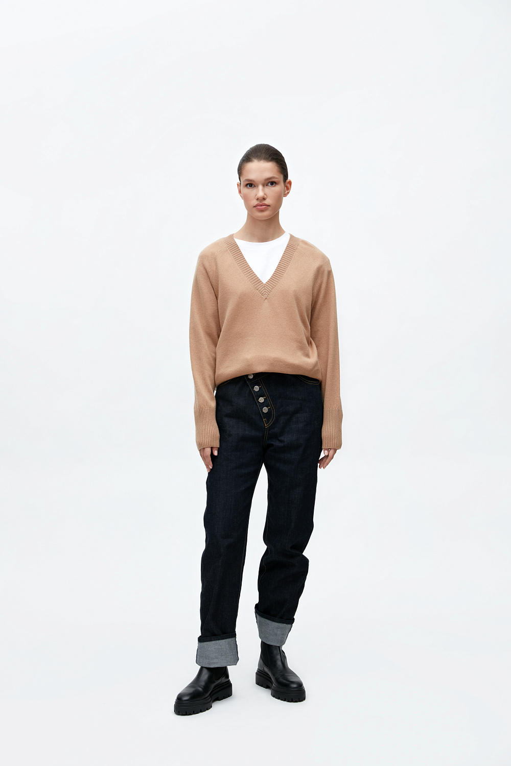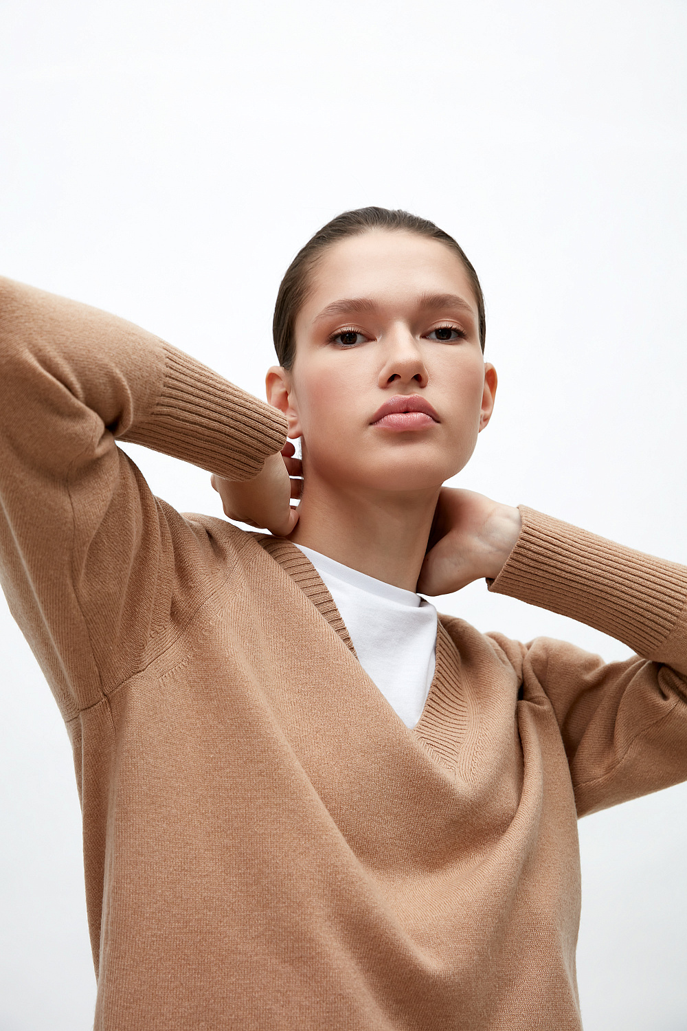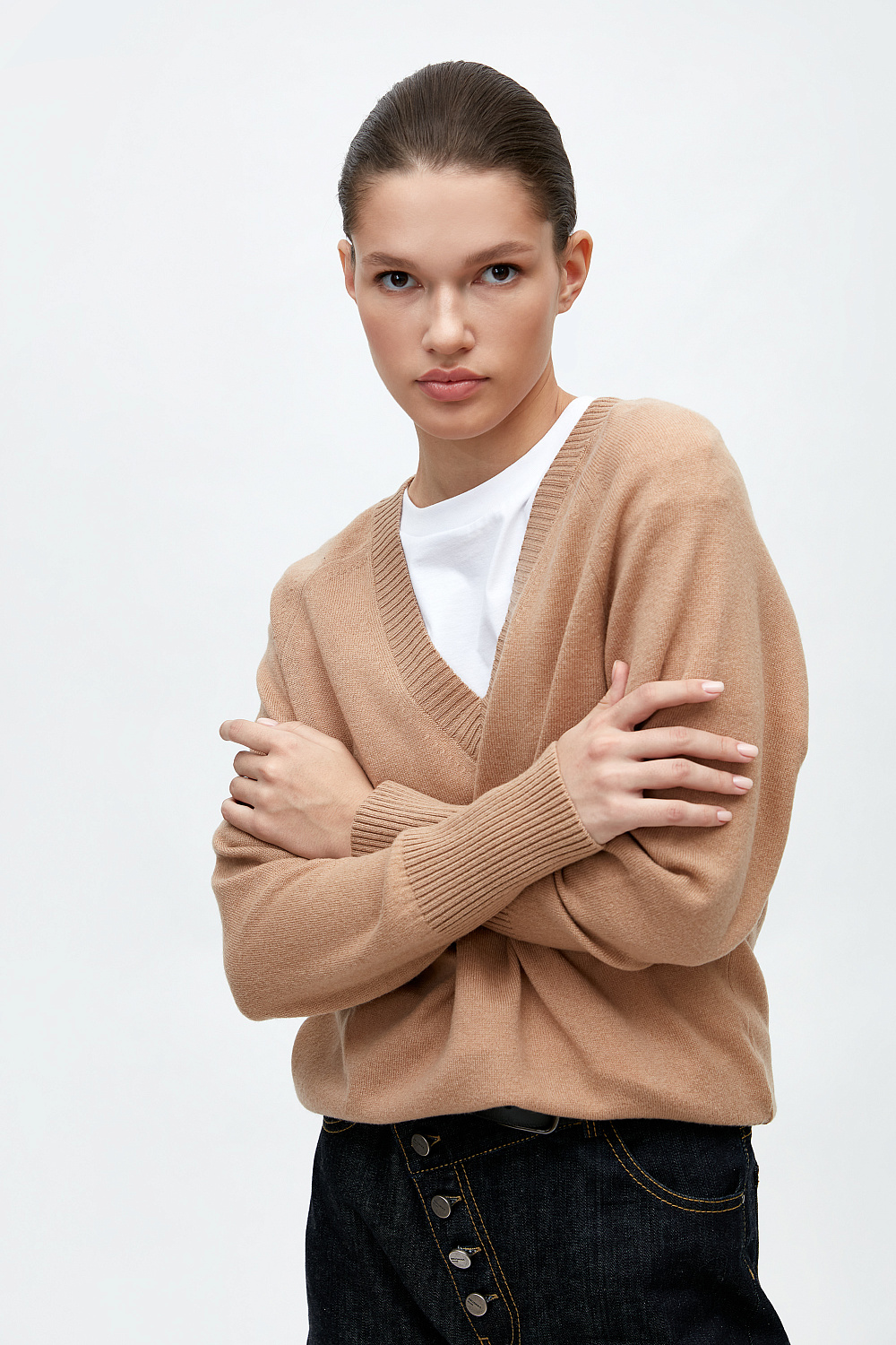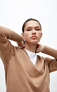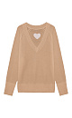 Knitted jumper made of wool with the addition of cashmere. Loose silhouette model with V-neck. The cuffs and bottom of the product are with elastic. Heart-shaped pattern on the back in a contrasting color.