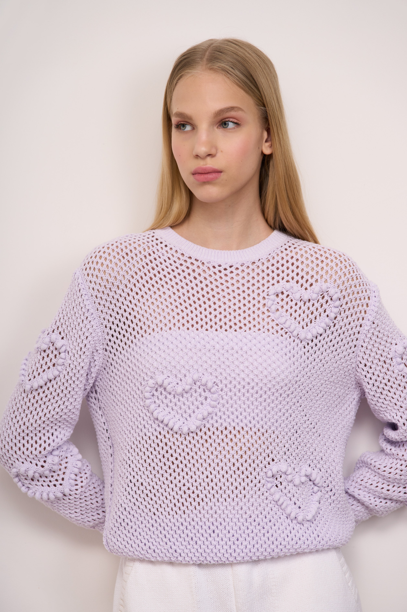 Loose cotton mesh jumper. Textured hearts. Round neckline. Adjustable cuffs, wide elastic at the bottom.