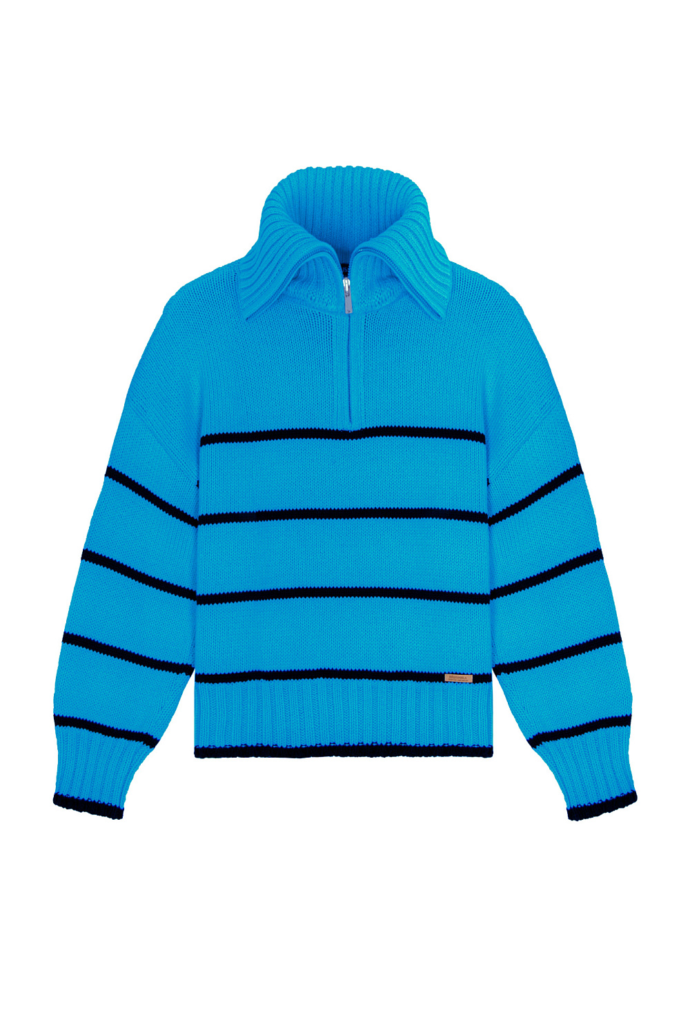 100% cotton striped knitted jumper. Stand-up collar with zipper. Bottom of the product with a branded label.