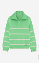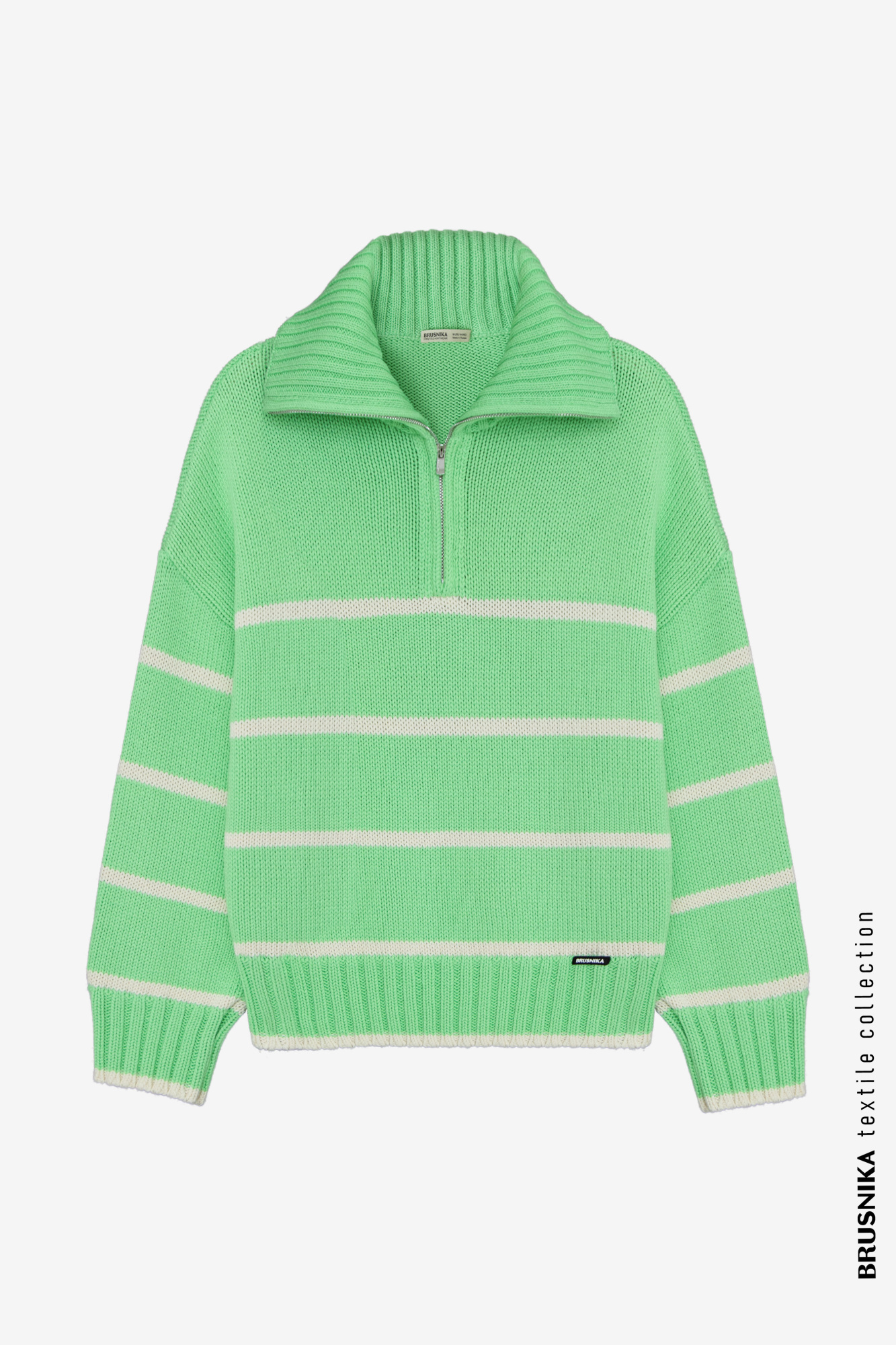 100% cotton striped knitted jumper. Stand-up collar with zipper. Bottom of the product with a branded label.