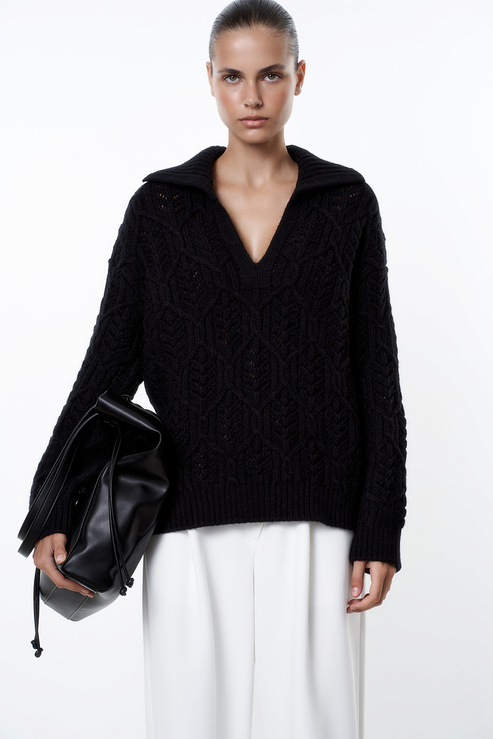 Openwork alpaca wool blend jumper with polo collar and V-neck. Adjustable cuffs on the sleeves.