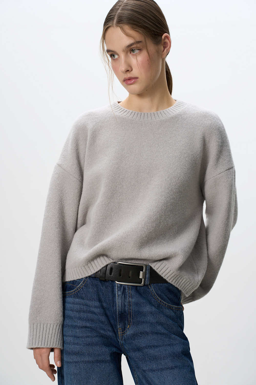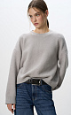 Knitted jumper made of wool blend with the addition of mohair. Loose silhouette model with dropped shoulders and a round neckline. The edges of the product are ribbed. You can complement the look with a skirt.