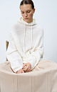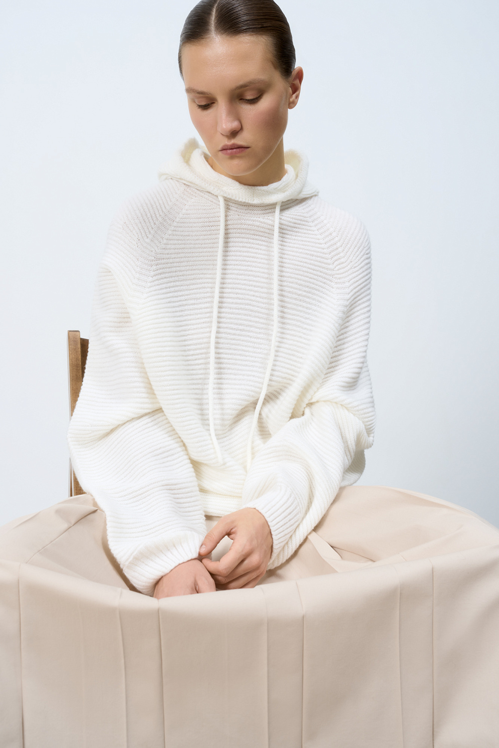 Wool blend knit jumper. Loose silhouette with a dropped shoulders and a hood with a drawstring. Ribbed edges.