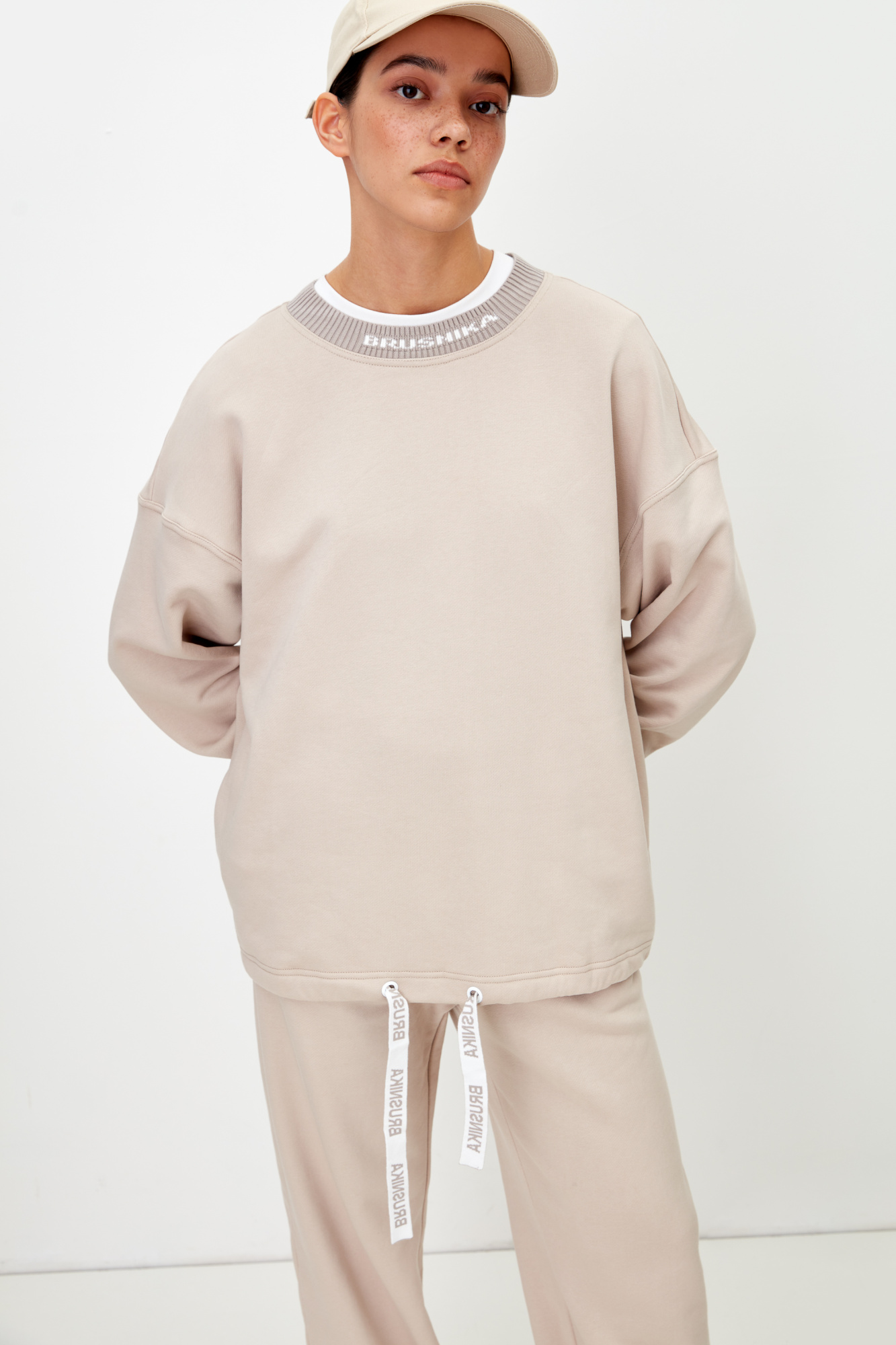 Cotton jumper with cuffs at the bottom. Branded ribbons.
