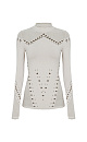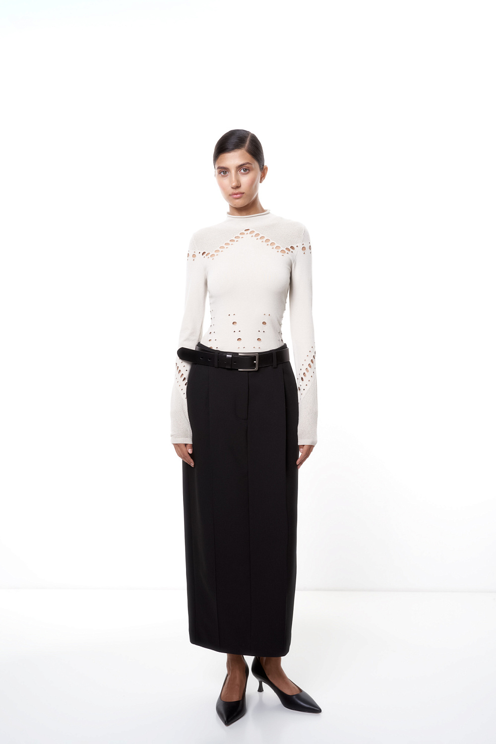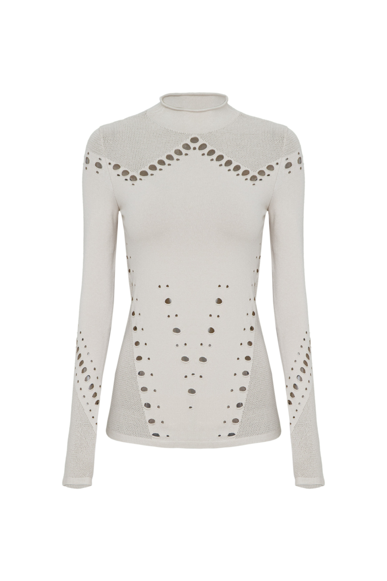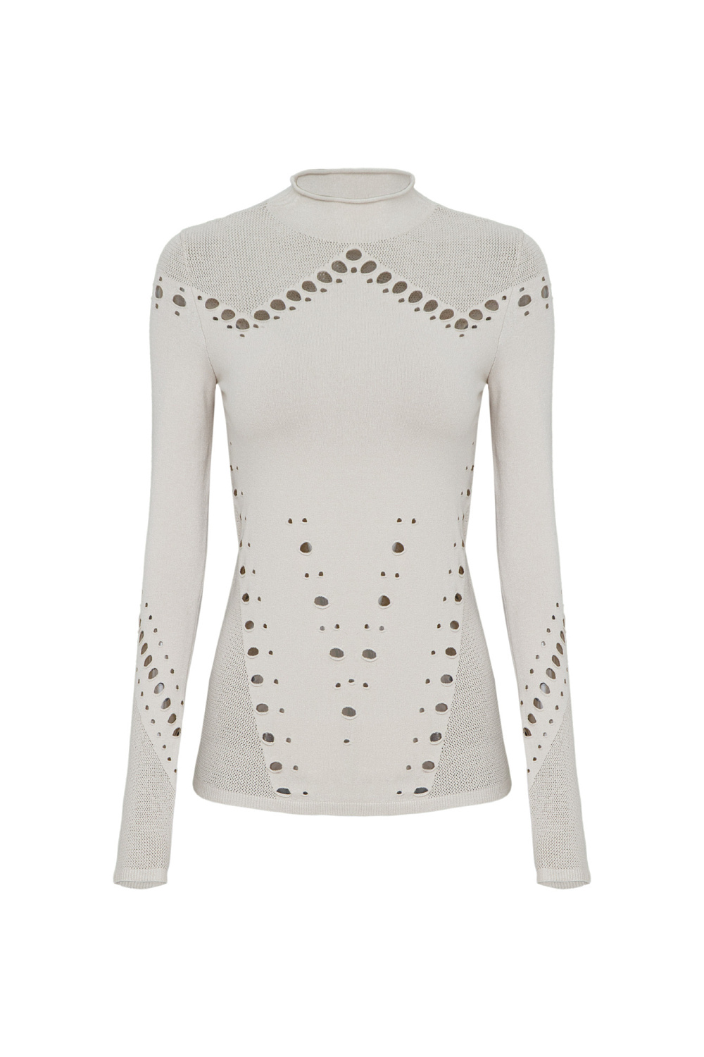 Longline turtleneck made of thin elastic viscose with mesh details and perforations.