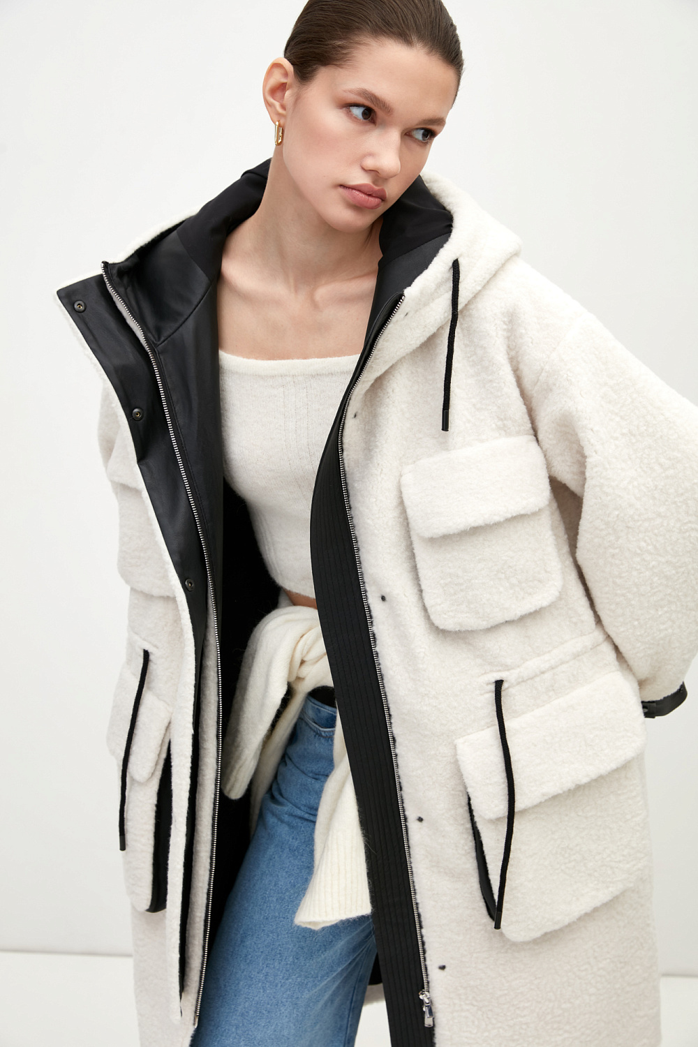 Faux fur parka with contrast faux leather trim, hood and large patch pockets