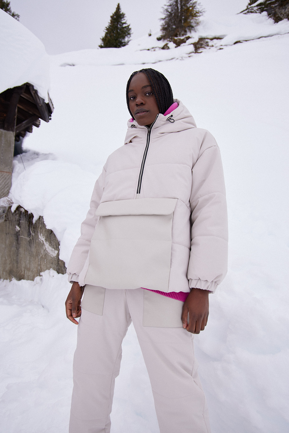 Nylon anorak jacket with water-repellent and windproof properties. The elastic drawstring allows you to adjust the width of the hood. Front zip fastening. Large pocket with clasps on the side.